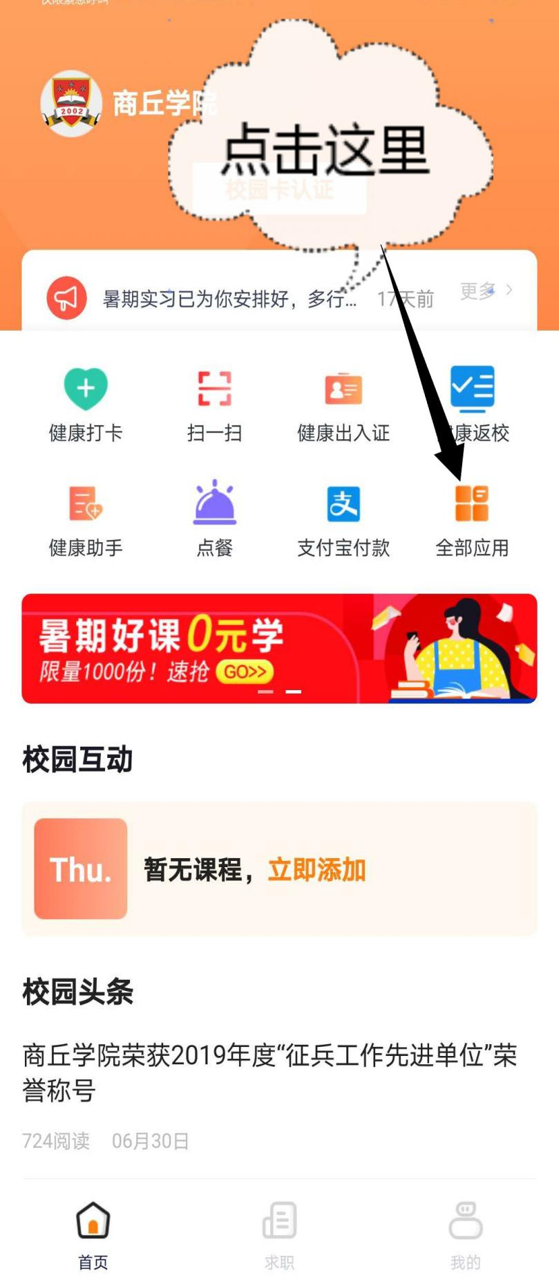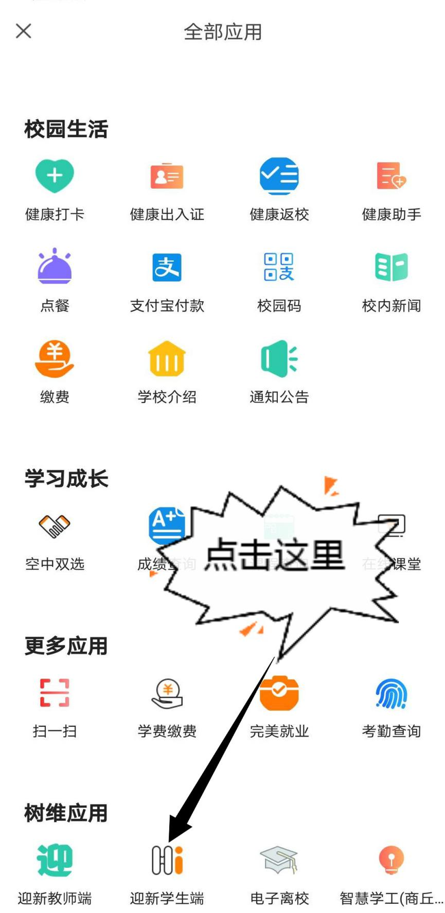2、在主页找到全部应用,下拉找到迎新学生端