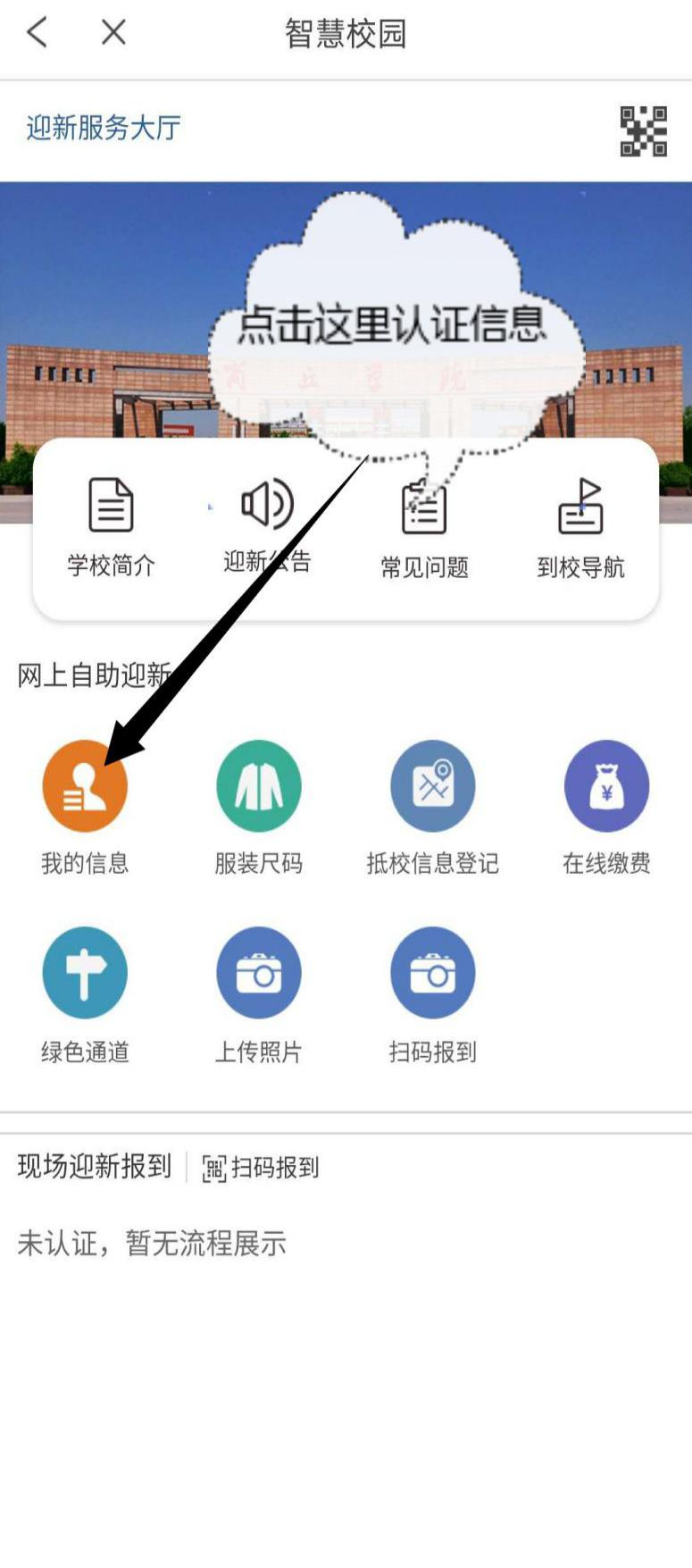 3、打开迎新学生端,点击我的信息,输入准考证号和姓名认证个人信息,个人信息输入无误后点击在线缴费进行缴费。