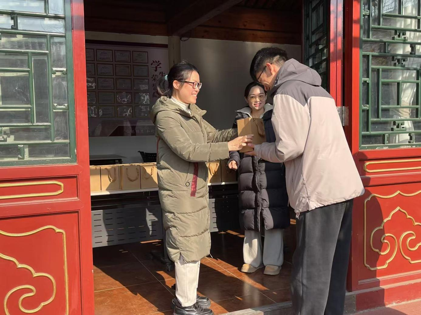 师生代表们为考研学子送上“考研加油包”。“考研加油包”的内容经过精挑细选,具有美好的寓意。其中,柿子和橙子寓意心想“柿”“橙”,即希望考研学子在逐梦路上奋勇前行,最终心想事成,拿到心仪学院的录取通知书。励志明信片正面是励志文案,背面是来自学弟学妹们的亲笔祝福。