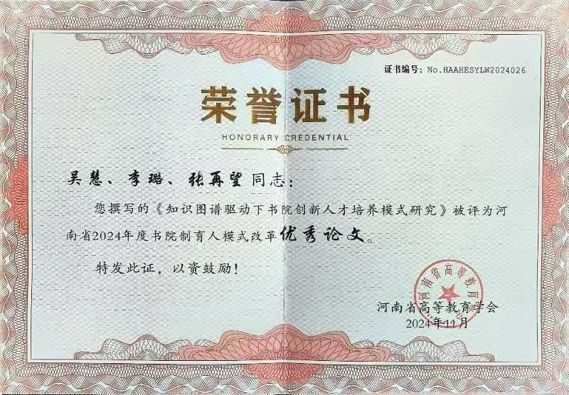 由我校副校长、党委副书记张再望,春来学院(弘德书院)副院长吴慧,春来学院(弘德书院)育人导师李璐共同撰写的《高校书院制育人模式创新的路径选择》和《知识图谱驱动下书院创新人才培养模式研究》荣获河南省2024年度书院制育人模式改革优秀论文奖。此奖项彰显了我校书院制育人模式在创新方面的积极探索和显著成效。