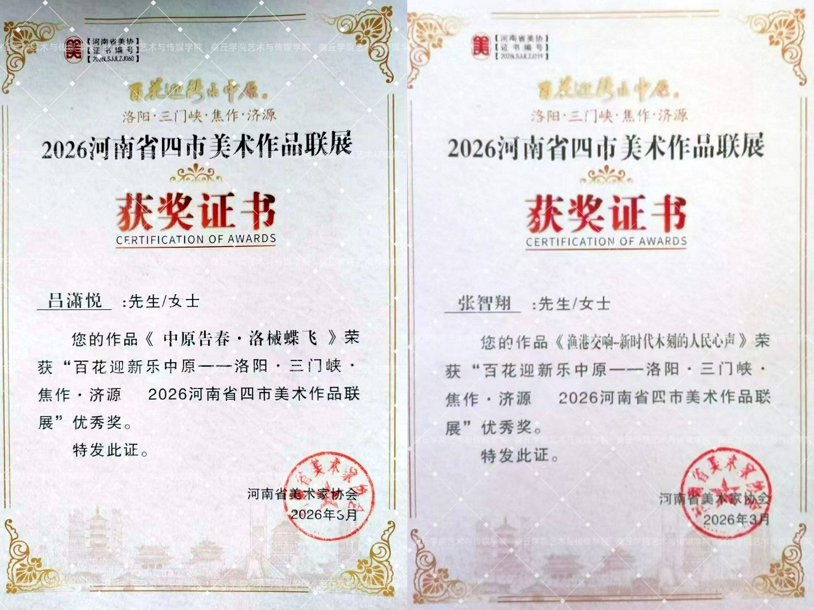 近日,由河南省美术家协会主办的“百花迎新乐中原——河南省洛阳、三门峡、焦作、济源四市美术作品联展”复评结果公布。在此次展览中,付江博教师指导的吕潇悦、张智翔两名学生创作的美术作品荣获优秀奖。