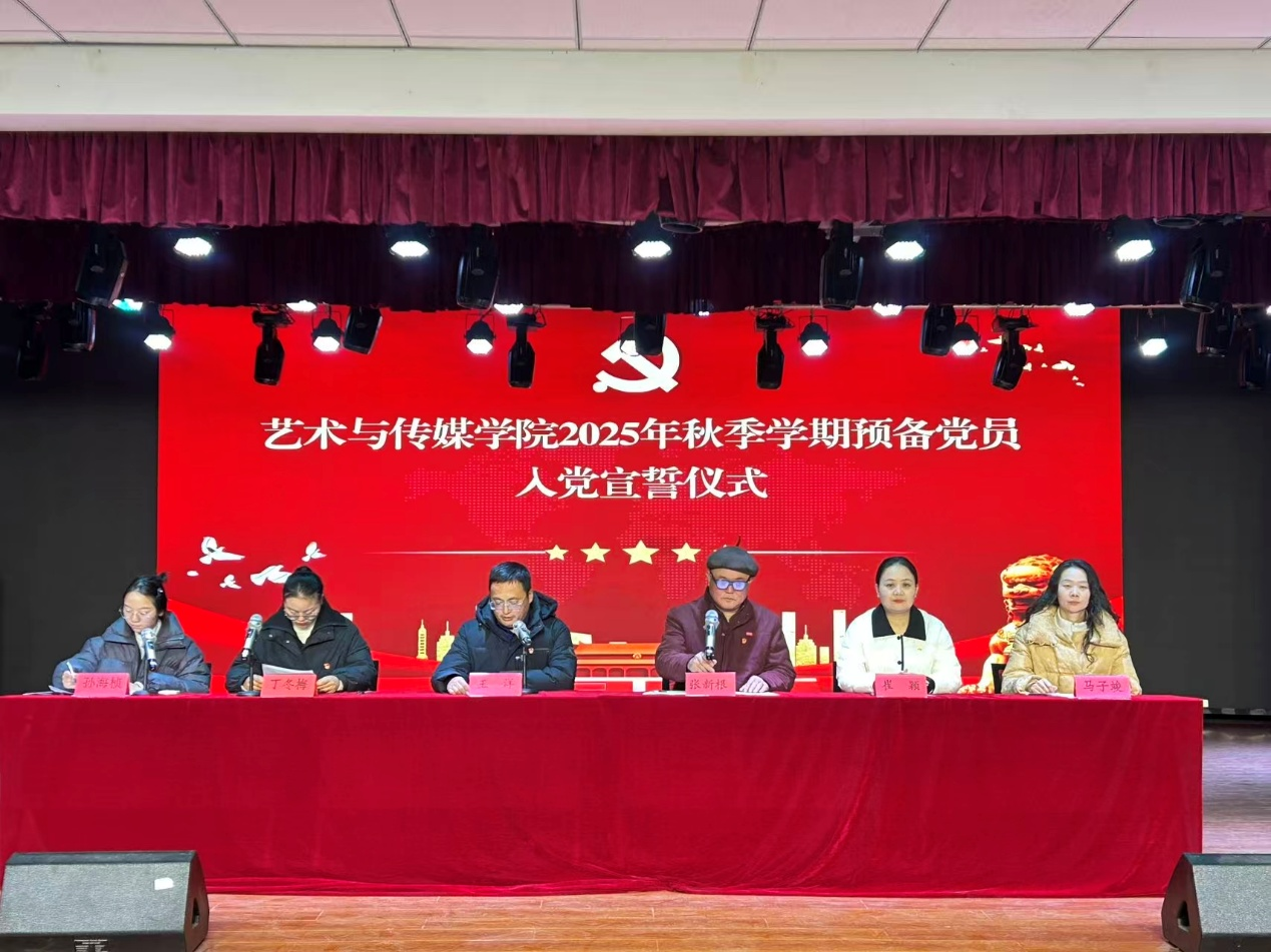 为强化新发展党员的党性意识与身份认同,2025年12月2日18:30,商丘学院艺术与传媒学院于艺术楼4007召开2025年秋季学期新发展党员入党宣誓大会。艺术与传媒学院党总支书记张新根、副书记王洋,党总支组织委员崔颖(兼纪检委员)、宣传委员丁冬梅、统战委员马子竣,党委组织员孙海桢及本学期新发展预备党员参会,党委组织部综合科陈欣雅、经济管理学院辅导员李彦列席,会议由孙海桢主持。