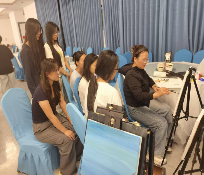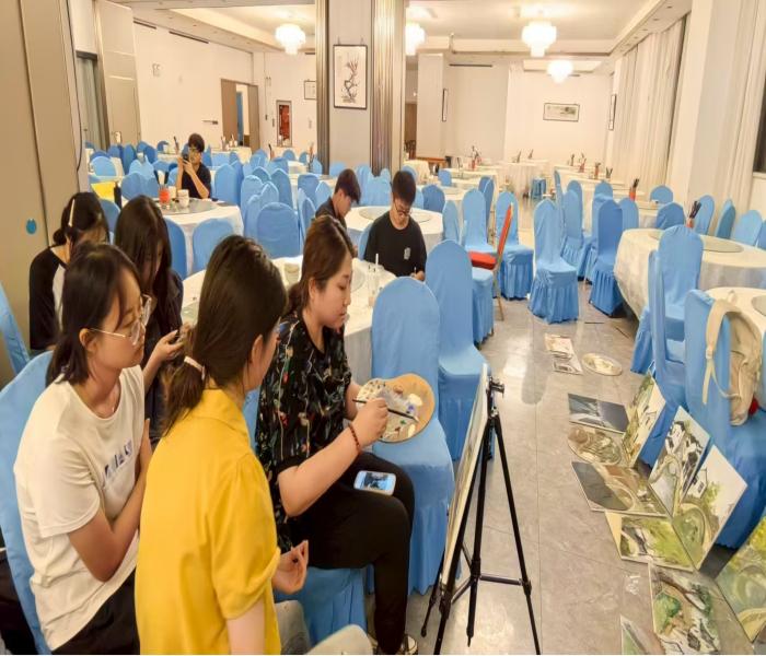 在写生过程中,老师们深夜仍坚守在临时画室,对学生的作品进行逐幅评讲与示范。他们俯身于画前,细品每一笔笔触的巧思,推敲每一层色彩的张力,从构图平衡到色彩表达,较真每一处细节。这种认真负责的态度,不仅是对艺术的敬畏,更是对学生成长的全力托举。学生们围聚在老师身旁,或专注聆听指导,或仔细观摩示范,在师生的交流互动中,不断提升自己的艺术创作水平。