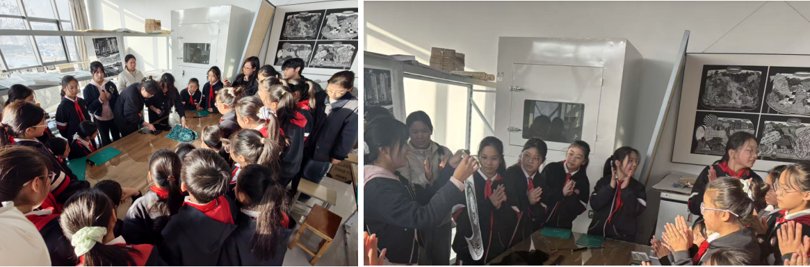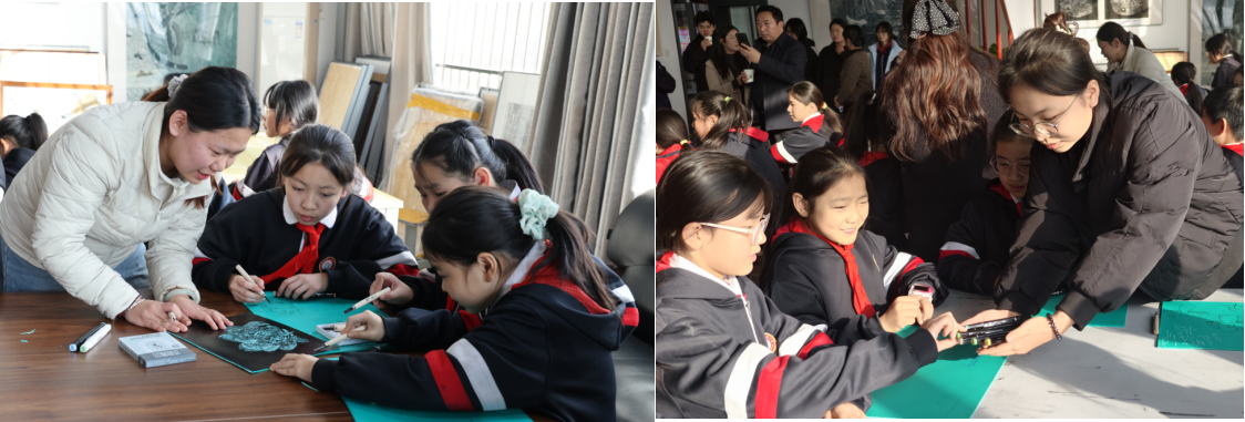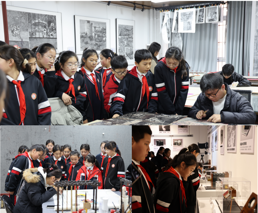孩子们在张院长和赵校长的陪伴下,开启了一段奇妙的艺术探索之旅。从版画工作室的刀木韵味,到书法工作室的笔墨书香;从视觉传达的现代创意,到环境设计的空间构想;再到“镜藏时光”与“扇艺华章”展览馆中的沉淀与华美……每一个空间都像一扇打开的窗,让孩子们窥见艺术世界的辽阔与深邃。大学校园里严谨的学术氛围与自由的创作气息,潜移默化地涵养着他们的审美感知。