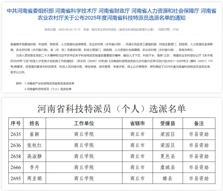商丘学院高度重视科技服务与社会贡献,积极组织教师参与申报,充分发挥高校人才与科技优势,服务地方经济社会发展。此次入选的5位教师专业背景涵盖食品工程、信息技术等领域,她们将分赴商丘市梁园区、夏邑县等一线地区,开展技术指导、成果转化、人才培养等科技服务,切实帮助解决农业生产和农村发展中的实际难题。