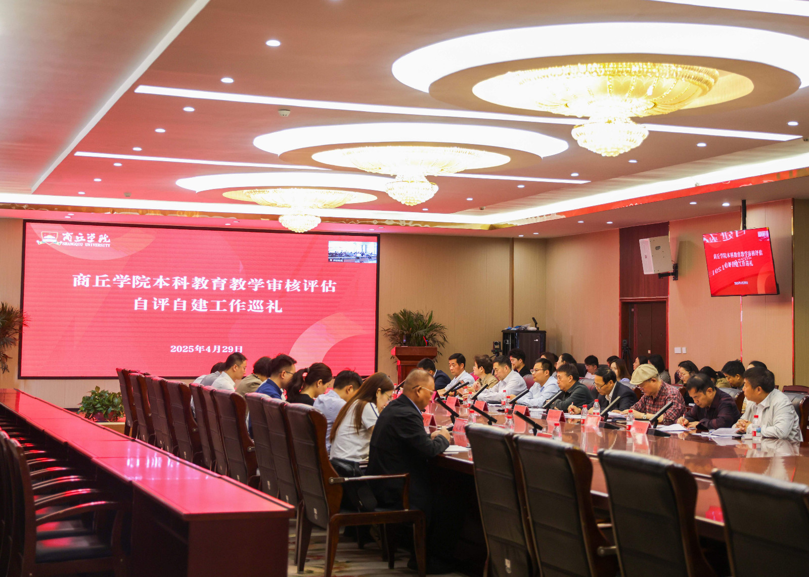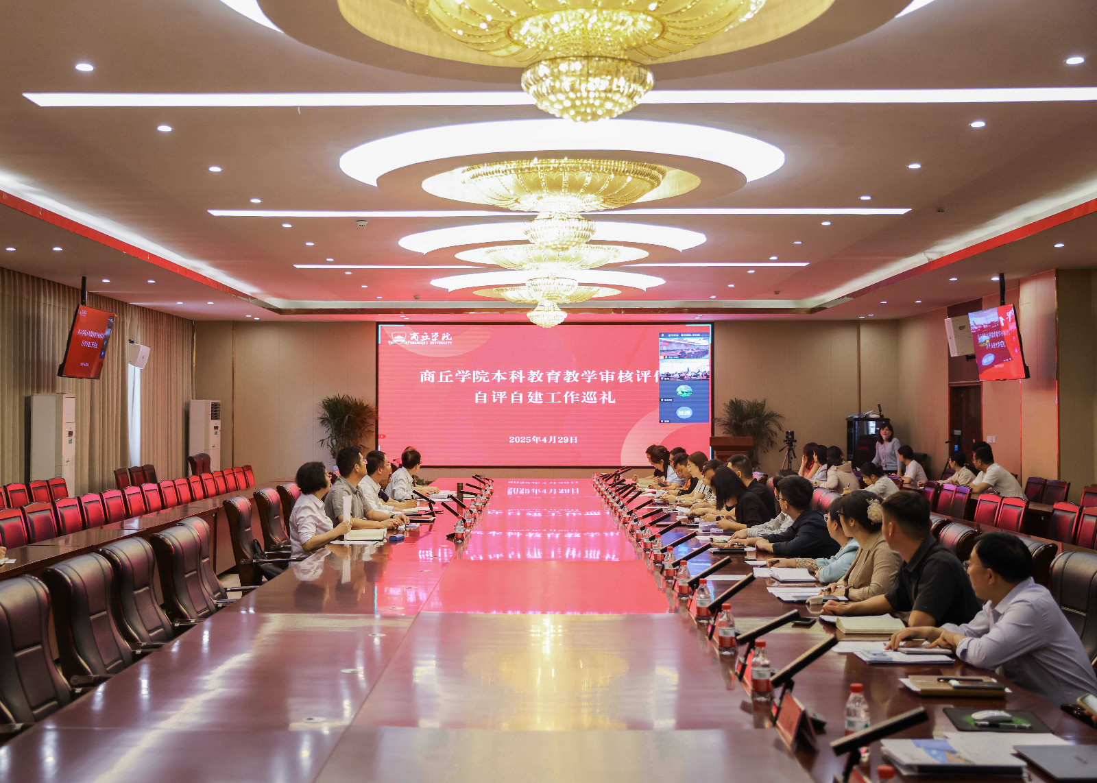 为高质量迎接本科教育教学审核评估,深入开展迎评自查自建工作,4月29日,商丘学院于商丘校区设主会场,开封校区设分会场,开展本科教育教学审核评估自评自建工作巡礼。商丘学院党委书记王勇军,商丘学院校长、党委副书记程印学,商丘学院应用科技学院校长、党委书记贺海鹏,春来教育集团教学促进办公室主任豁泽春,两校区全体中层领导出席巡礼。巡礼由商丘学院副校长潘一展主持。