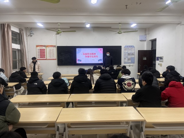 班会伊始,辅导员们向同学们介绍了宪法作为国家根本法的地位与作用,结合大学生日常学习生活案例,讲解了与校园安全、权益保护相关的法律法规要点。随后,各班组织了“宪法知识小问答”互动环节,同学们积极参与,在趣味交流中加深了对法律条文的理解。最后,辅导员们带领大家共同签署“守法青年承诺书”,引导学生将法治意识转化为日常行为准则。