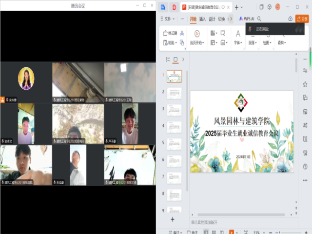 为弘扬社会主义核心价值观,增强我院学子道德责任感和社会责任感,构建学生诚信、自强教育体系,11月12日,风景园林与建筑学院组织全体25届毕业班通过线上线下的形式开展毕业生就业诚信教育会议,本次会议由各毕业班辅导员主持。