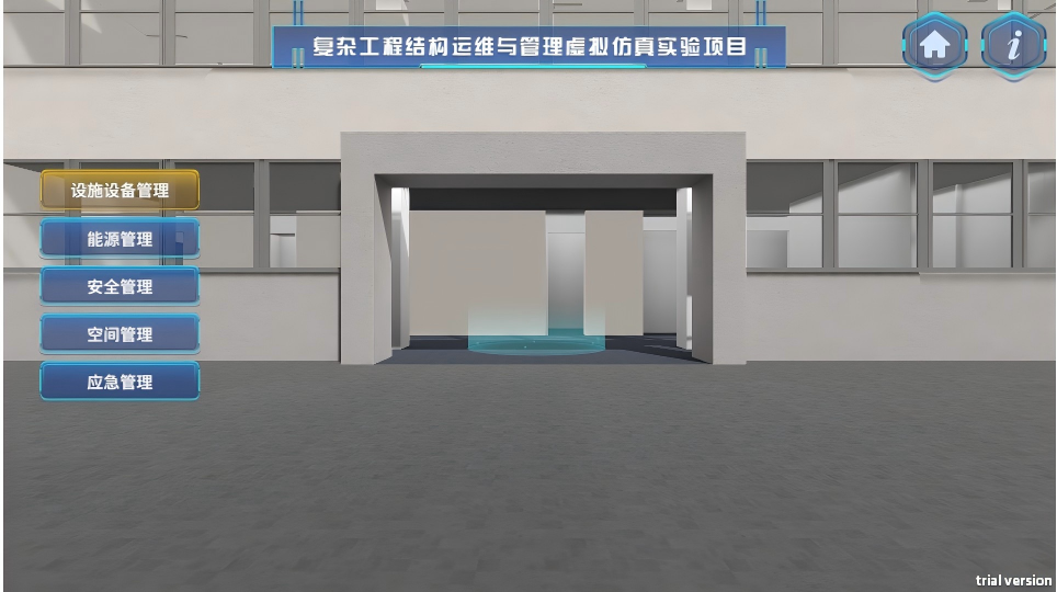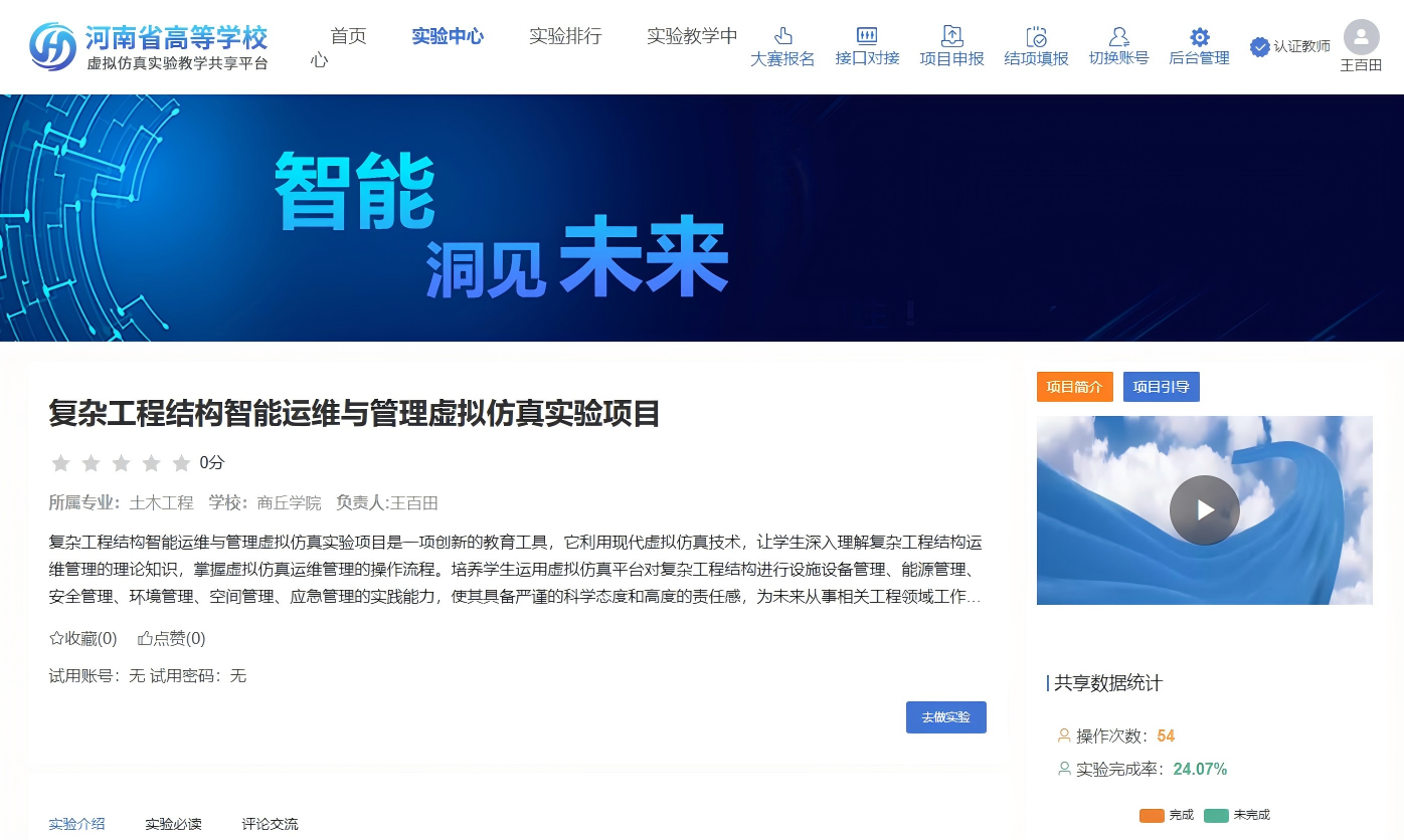 复杂工程结构智能运维与管理虚拟仿真实验项目所属中心是河南省土木工程虚拟仿真实验教学中心,该项目于2023年8月9日(教高〔2023〕271 号)立项,团队成员有王百田(副教授,方案设计)、尚慧洁(副教授,实验设计)、李芳琪(讲师,技术指导)、殷振国(高级工程师,技术指导)、王吉(工程师,系统制作)、彭倩倩(副教授,组织协调)、李金亨(技术经理,技术协调)。进行该实验需要个人先注册(网址:https://hnilab.com/#/index)之后进行登录,然后点击实验中心在下方搜索框中输入复杂工程结构智能运维与管理虚拟仿真即可找到该项目,之后点击去做实验即可参加该实验。该实验项目主要是让学生深入理解复杂工程结构运维管理的理论知识,掌握虚拟仿真运维管理的操作流程。培养学生运用虚拟仿真平台对复杂工程结构进行设施设备管理、能源管理、安全管理、环境管理、空间管理、应急管理的实践能力,使其具备严谨的科学态度和高度的责任感,为未来从事相关工程领域工作奠定坚实基础。