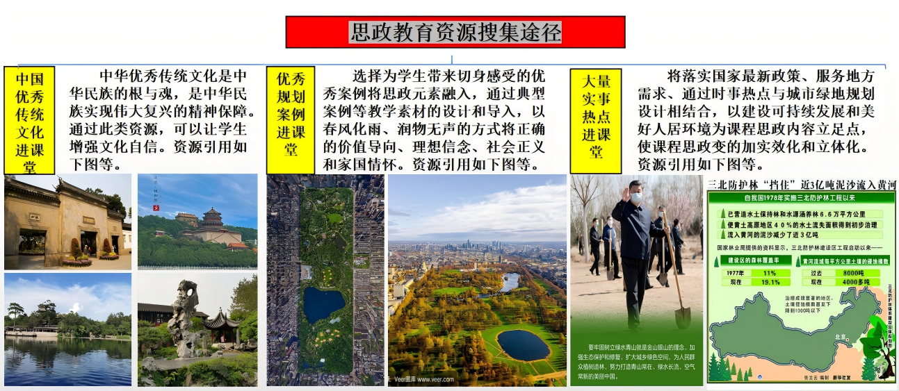 课程思政设计结合地方应用型本科高校定位,培养复合型人才是时代所需,从学生主体地位出发,紧紧围绕着培养社会主义核心价值观,通过分析“城市绿地系统规划”课程特点、课程实践、教学效果和现有教学环境,探索及创新课程思政融合路径,设定课程思政建设目标。即:加强思政元素与专业理论知识的有机融合,激发并弘扬学生的生态环保意识、公共健康意识和文化传承精神,强化学生的“四个自信”,全面提高学生的思想水平、厚植其爱党、爱国、爱民情怀,使其成为“有理想、有本领、有担当”的优秀管理人才。