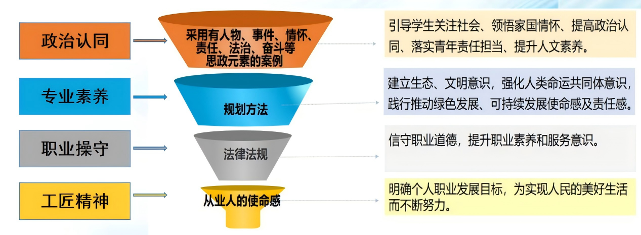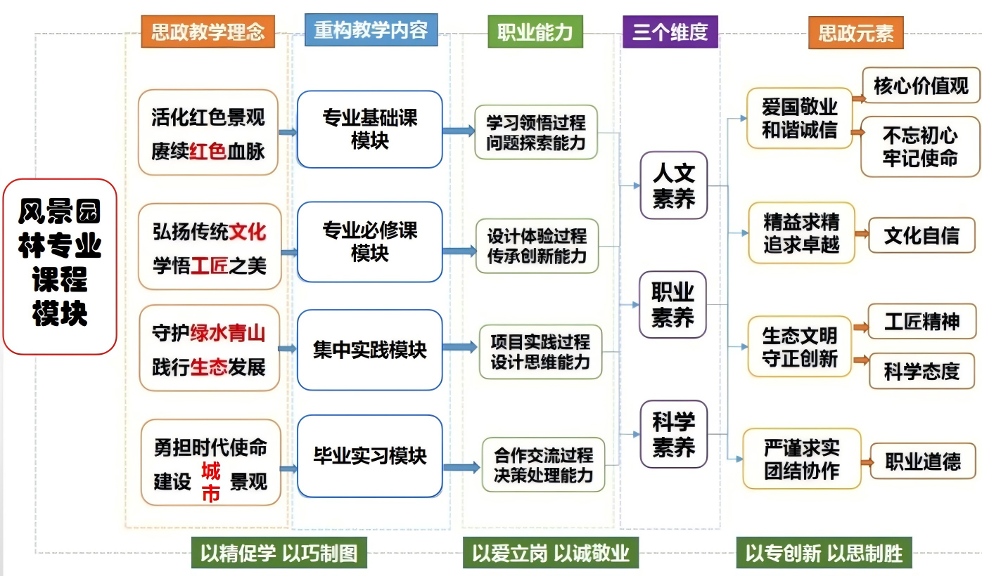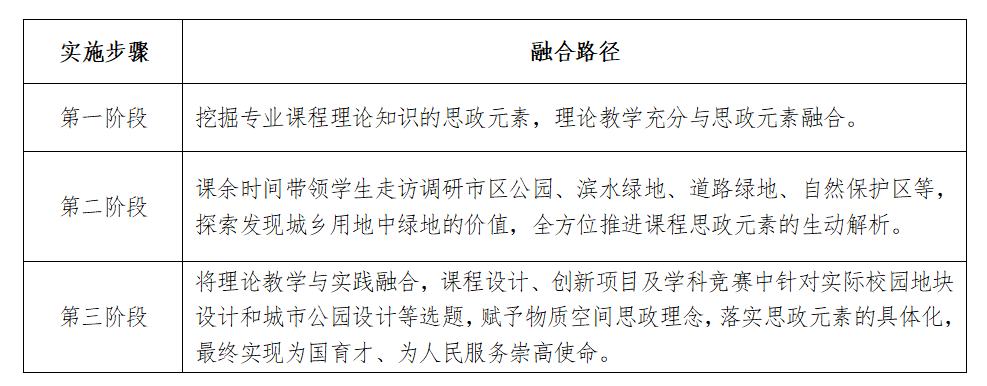 在课程专业知识体系中融入理想信念教育、传统文化教育、法治教育、职业道德教育;在教学过程中强化学生的政治认同,深化学生的家国情怀,开阔学生的时代视野,增强学生的专业素养,培养学生的工匠精神。注重学生德智体美劳全面发展,使学生富有社会责任感、团队精神和创新思维,掌握风景园林专业的基础理论,引导学生致力于生态环境改善和保护地区风景资源,提升城乡人居环境品质,培养具备风景园林规划设计与种植养护实践能力的高级专业技术人才。