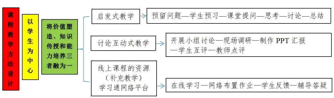 城市园林绿地系统规划课程具有多学科交叉、直观性好、理论与实践结合性强等特点,教学方式应从以教师为中心转变为以学生为中心。通过讨论式、参与式等教学法强调师生和生生之间的有效互动,有利于实现由灌输式教学向启发式教学的转变。教学方法主要采用(见下图):启发式教学、讨论互动式教学、利用线上课程资源补充教学。