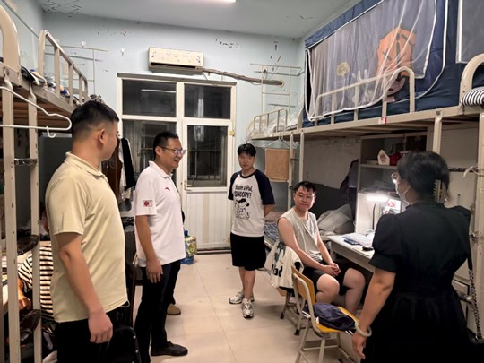 走访中,王百田书记细致查看了宿舍楼的公共区域环境、消防设施安全、水电使用情况及宿舍内部基本设施完好程度,并不时与随行楼管交流,就发现的问题现场提出改进要求。他走进多间学生寝室,与同学们围坐在一起亲切交谈,从学业压力到生活琐事上,一一关心。同学们也积极分享在校生活的感受,并就运动设施使用、宿舍报修效率等方面提出了诚恳的建议。辅导员们认真聆听、详细记录,叮嘱同学们要科学规划时间,兼顾学习与休息,加强体育锻炼,保持积极乐观的心态。王百田书记还以近期高校发生的安全案例为例,再三强调宿舍安全是底线红线,要求同学们务必做到不使用违规电器、妥善保管个人物品,共同维护安全、和谐、有序的居住环境,筑牢校园安全防线。