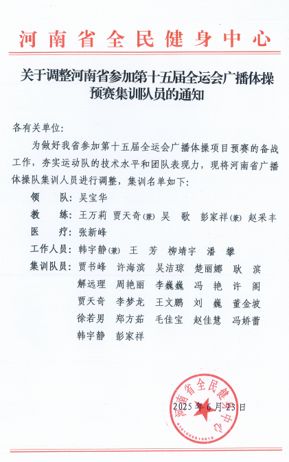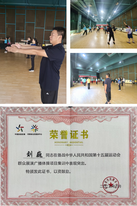 为做好河南省参加第十五届全运会广播体操项目预赛的备战工作,由河南省体育局牵头,河南省全民健身中心组织,经过全省层层选拔后,河南省全民健身中心发布了《关于调整河南省参加第十五届全运会广播体操预赛集训队员的通知》,确定了河南省广播体操队集训人员,并代表河南省参加中华人民共和国第十五届运动会广播体操比赛。我校教师刘巍入选成为集训队员,并在备战和群众展演集训中表现突出,获得相关荣誉。(供稿:党委宣传部 审核:张亚美 编审:李博 签审:孙宜杰)