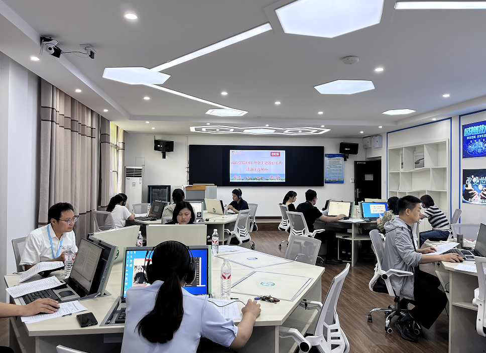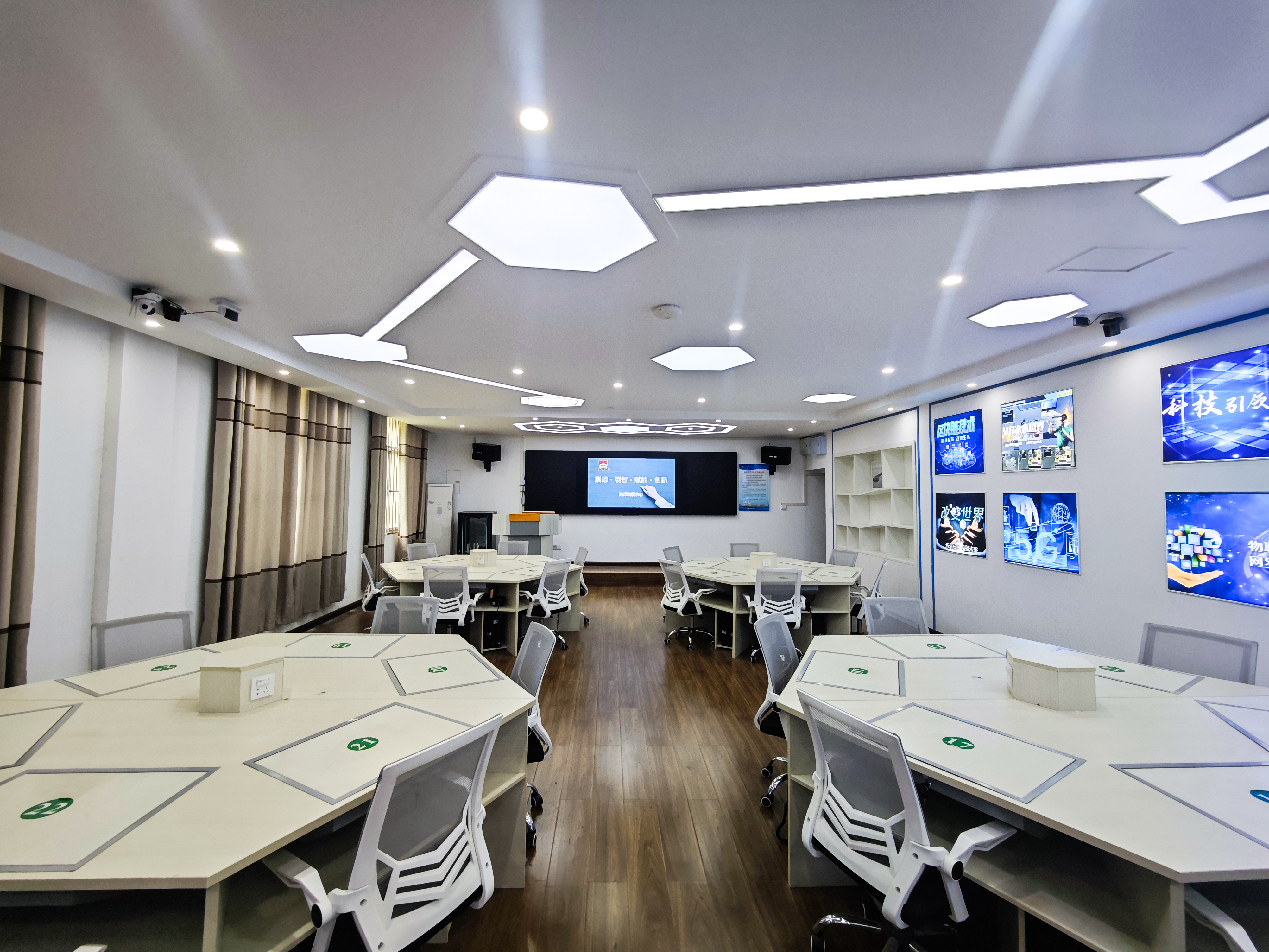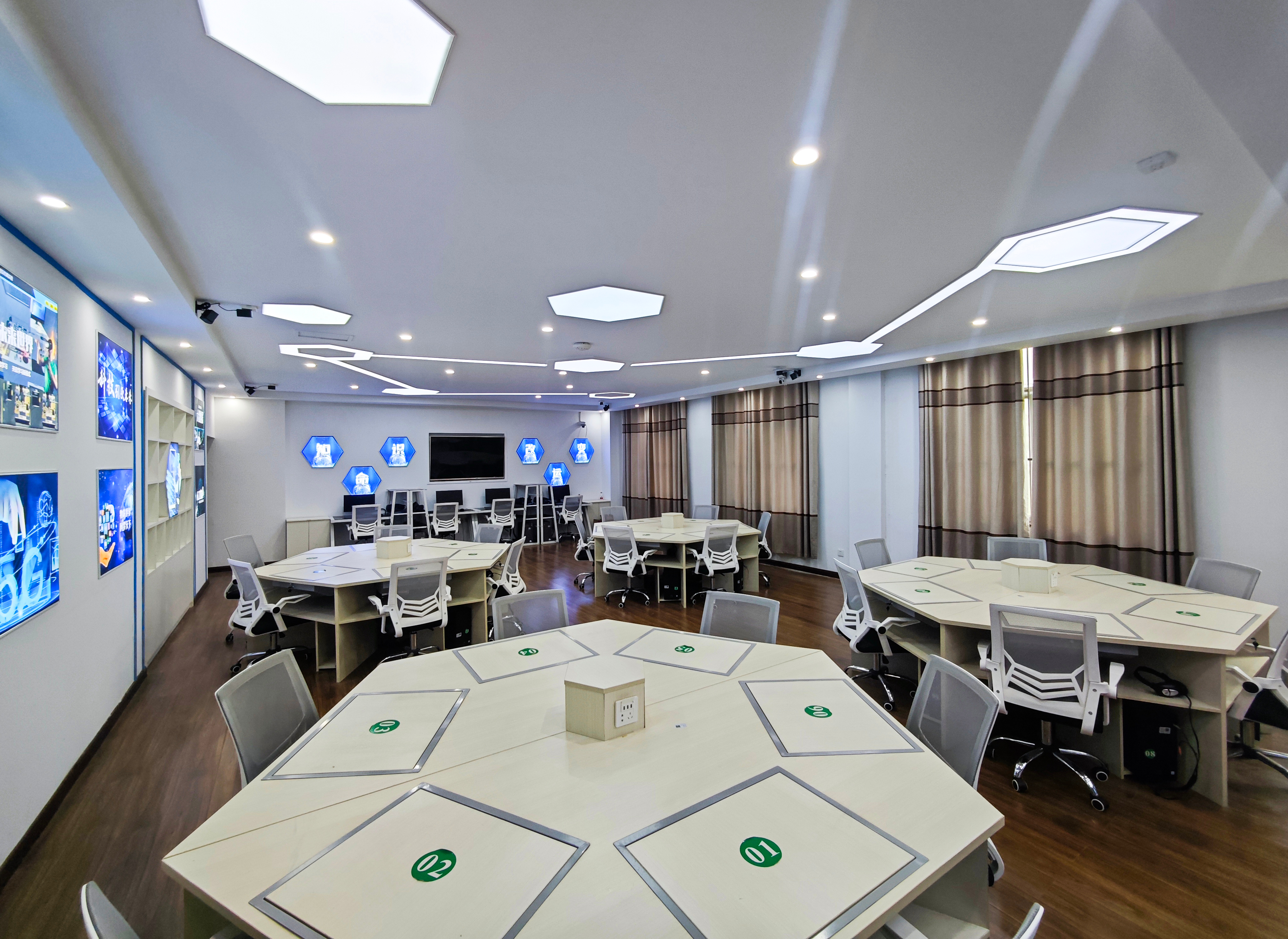 K105:数字技术培训室。数字技术培训室是由多媒体计算机、智慧授课系统、多学科虚拟仿真课程和开放式资源管理平台组成,实现教学、实践、实验、考核等过程的智能化,用于线上资源的培训和实操。