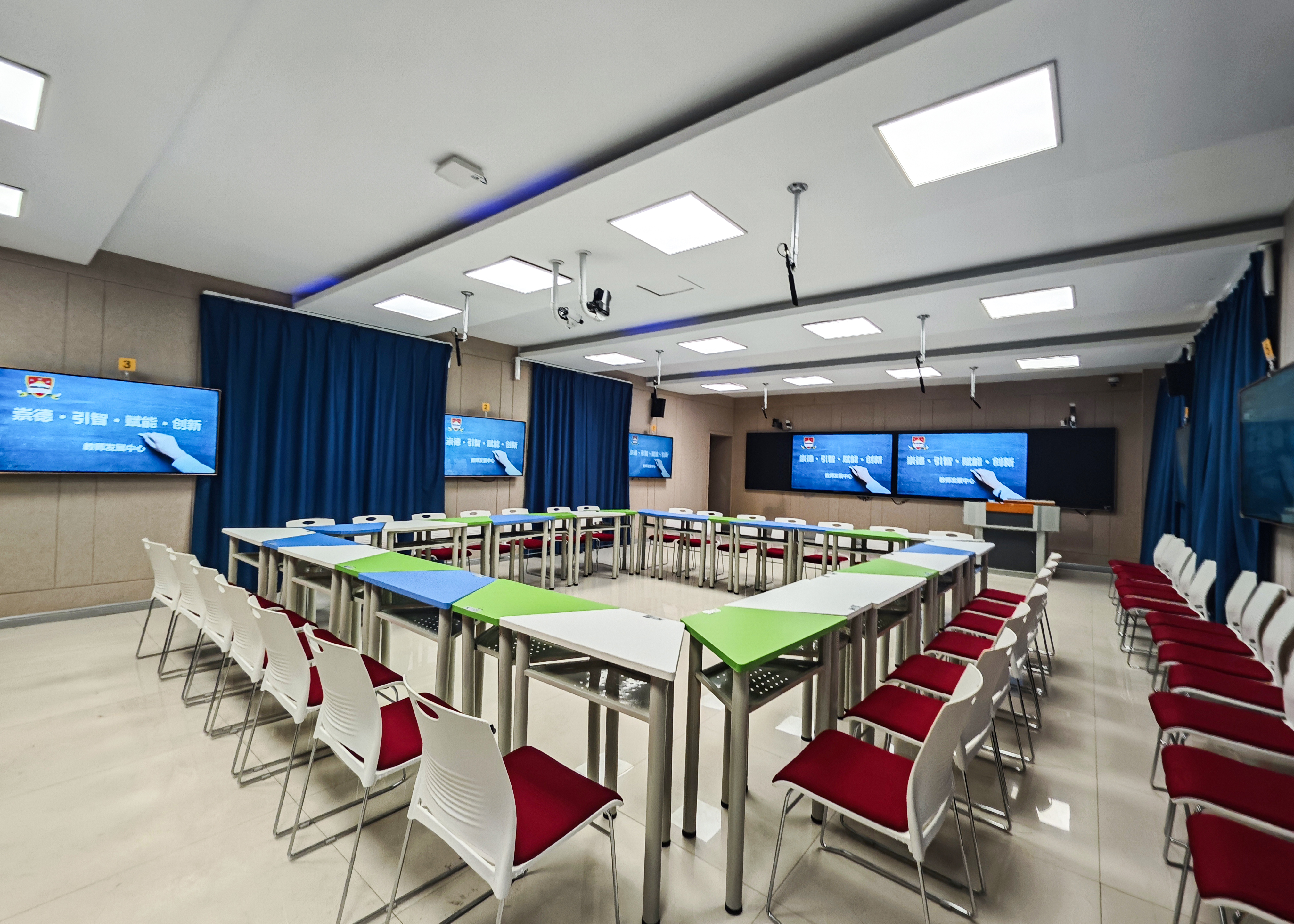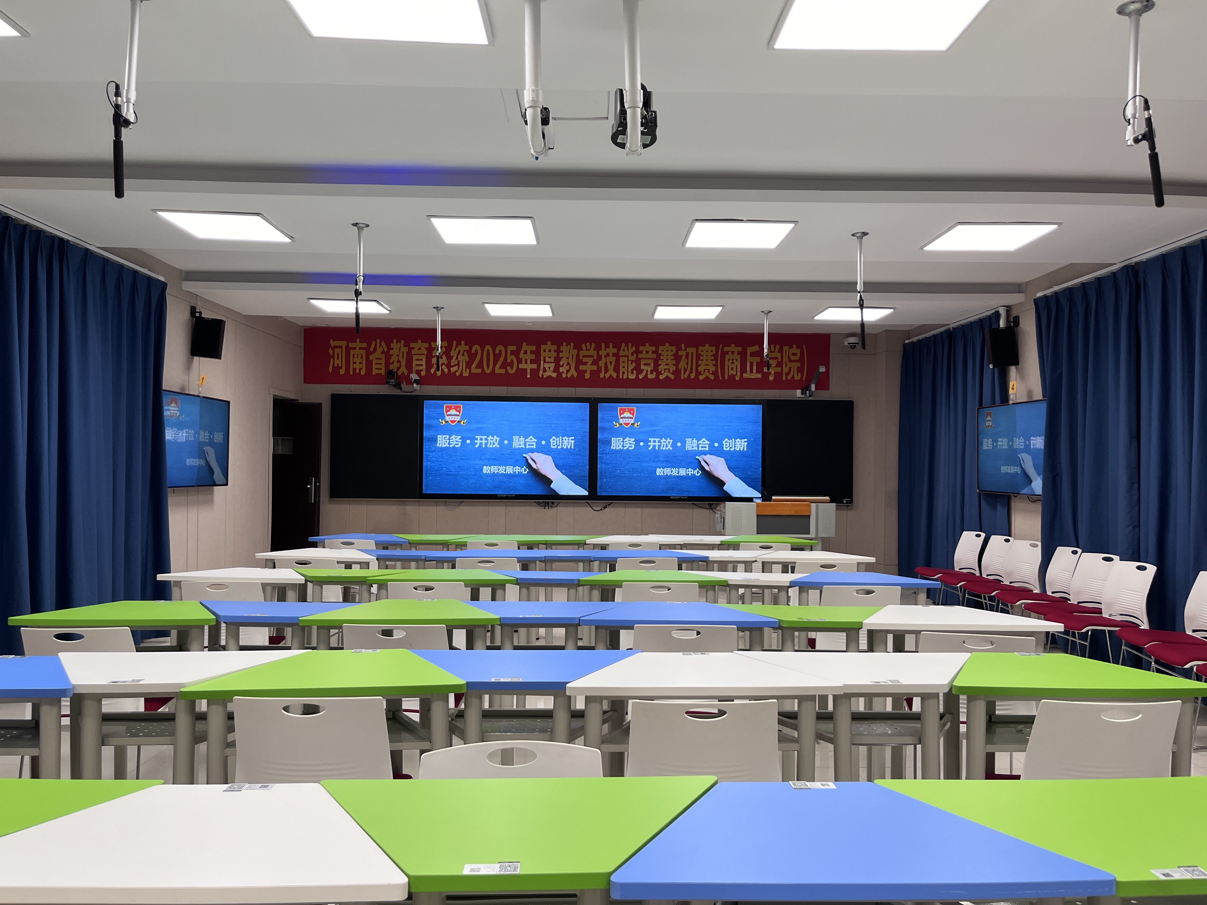 K307:教师培训活动室。教师培训活动室配备了精品录播系统、互动教学系统、多屏互动系统等,有效实现培训和课堂教学中人人交互、人机交互,促进启发式教学、探究式教学、参与式教学等新型教学活动的进行。实现以教学为中心向以学习为中心的变革,以传授知识向能力培养为主的变革,以课堂学习为主向多种学习方式的转变,开启了我校建设智慧教学环境和深化教学改革的新起点。