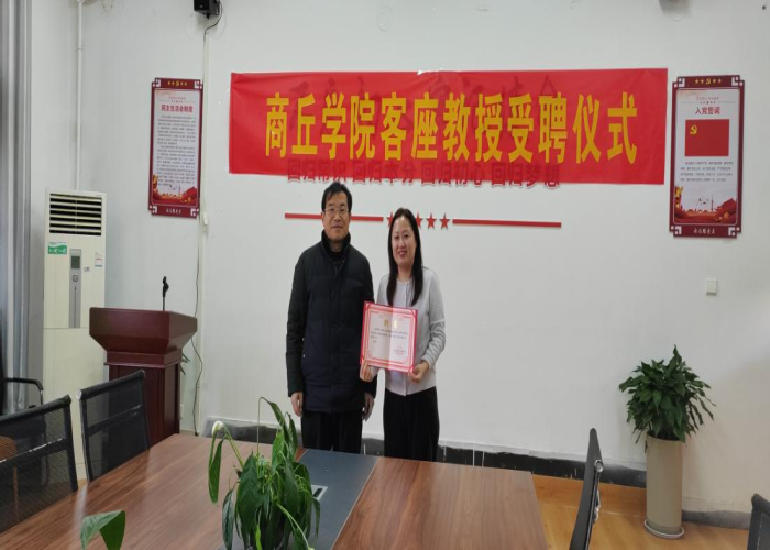 2026年1月8日下午,商丘学院经济管理学院在学院会议室隆重举行客座教授聘任仪式。仪式现场气氛庄重热烈,经济管理学院院长刘玉来、副院长刘健康出席仪式,并正式聘任上海禹合企业管理咨询有限公司CEO曹月华女士为经济管理学院客座教授。