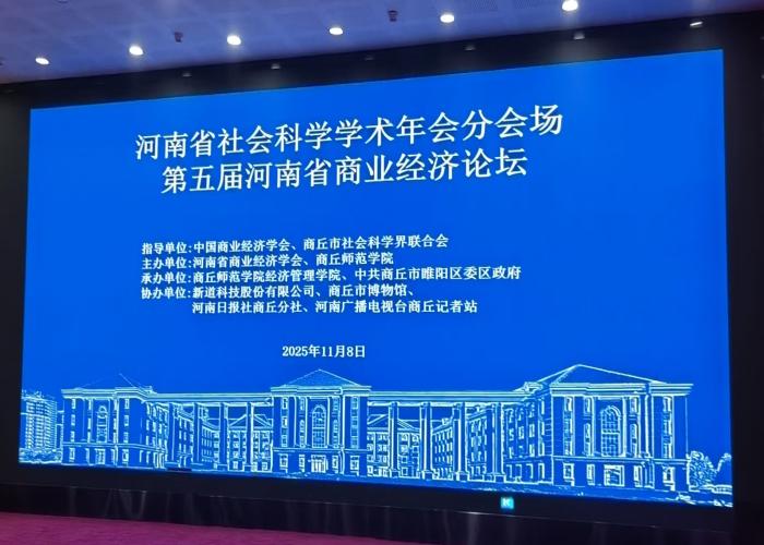 2025年11月7-8日,经济管理学院院长刘玉来教授率学院教师代表一行赴商丘师范学院参加“第五届河南省商业经济论坛”。本次论坛以“寻根铸魂,以文兴商”为主题,旨在深入学习贯彻党的二十届四中全会精神,总结商业经济科研成果,推进实体商业转型升级,促进河南商业经济的繁荣发展。论坛由河南省商业经济学会、商丘师范学院、中国商业史学会豫商史专委会、中国商业经济学会自由贸易港(区)专委会联合主办,吸引了来自全国各地的专家学者、商界精英、政府官员以及青年学者等六十余人参加,其间进行了在商文化寻根活动。今日头条、河南日报客户端、大象新闻、中原经济网等多家知名媒体进行了报道。刘玉来院长受邀在论坛上发布《2024—2025年度河南省商业企业(品牌)研究报告》。