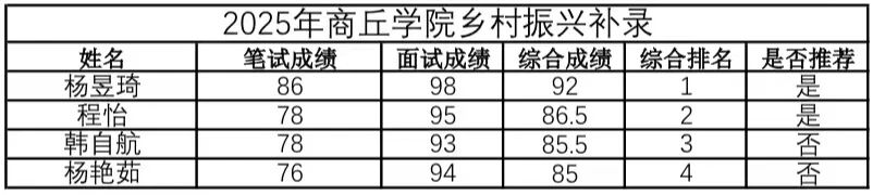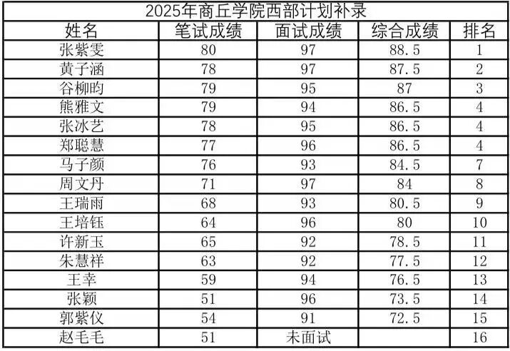 根据《2025年河南省大学生志愿服务西部计划志愿者宣传招募选派工作指引》要求,结合我校实际,按公平、公正、公开原则,经学生报名、资格审查、线上笔试、线上面试等环节补录,现将大学生西部计划及乡村振兴项目补录考试成绩公示。