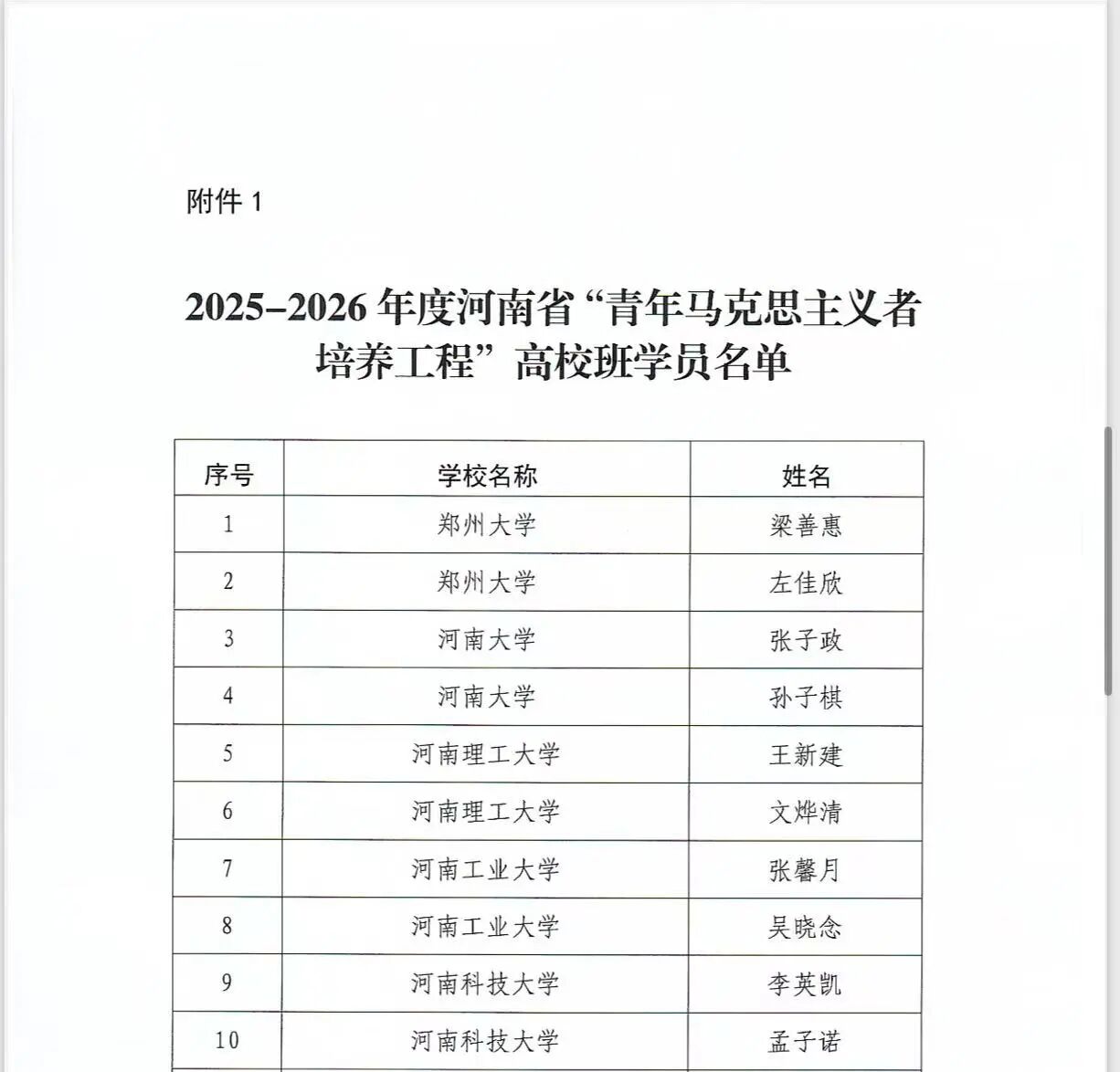 近日,共青团河南省委公布了2025-2026年度河南省“青年马克思主义者培养工程”高校班入选名单。