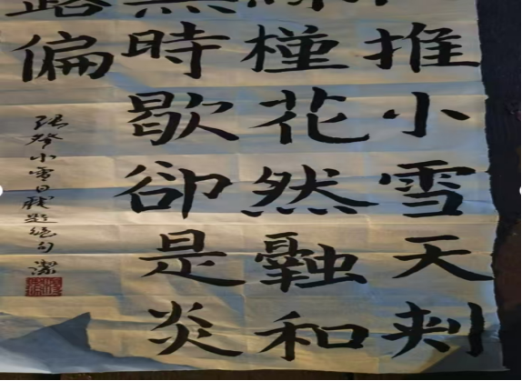 这副作品可太有味道啦!字体是古朴的隶书,笔画厚重又带着灵动的韵味,像把岁月里的笔墨温度都揉进了纸里,内容选的诗句配上这墨色,既有“推小雪天”的清冷意境,又有笔墨间的烟火气,左边的落款和印章更是点睛——既见书法功底,又藏着篆刻协会的巧思,把传统书画的“雅”和“韵”都给立住啦!有味道啦!字体是古朴的。
