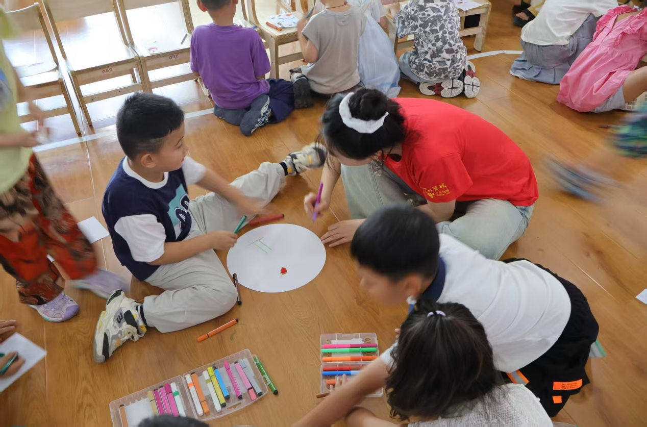 在绘画环节,志愿者们以“我心中的祖国”为主题,指导孩子们用画笔描绘五星红旗、天安门等元素。孩子们认真涂画,一幅幅充满童真的作品展现了他们对祖国的纯真情感。