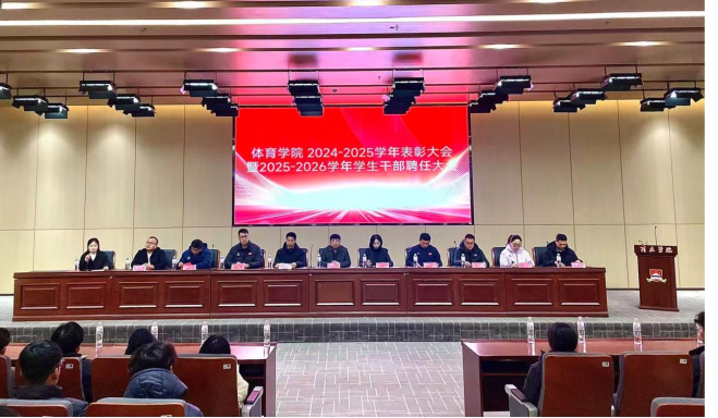 12月4日上午10时,体育学院2024-2025学年学生表彰暨2025-2026学年学生干部聘任大会在图书馆五楼会议室隆重召开。学院党总支书记、院长马明,党总支副书记刘莉莉出席会议;公共体育教研室主任崔本来、运动竞赛中心主任刘巍、专业技能教研室主任姜潘、专业理论教研室主任苏浩、体质测试中心主任张博、教学秘书祝盼、团总支书记朱天宇、辅导员董云阔及校院两级学生组织代表、全体学生干部、学生代表参加会议。