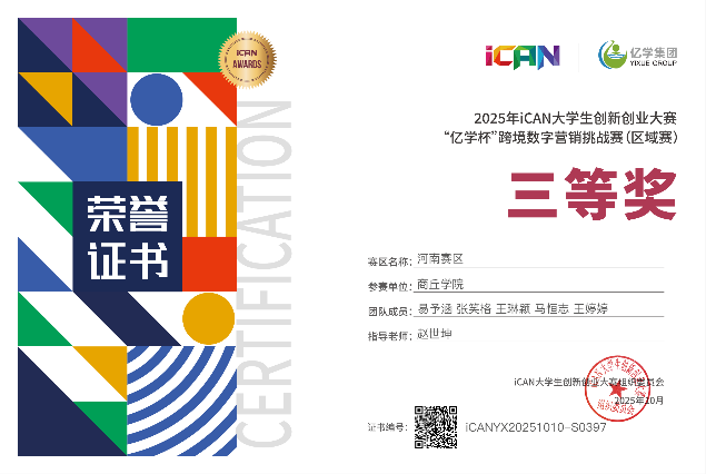 近日,由iCAN大学生创新创业大赛组委会、全国商务英语实践技能大赛组委会主办、湖南交通职业技术学院承办,亿学集团协办的2025年iCAN大学生创新创业大赛“亿学杯”跨境数字营销挑战赛高职组全国总决赛以线上直播的形式圆满落幕。这场汇聚全国高职精英的数字营销盛宴,不仅展现了新时代青年的创新活力与创业激情,更为数字营销领域注入了新鲜血液与无限可能。我院商务英语专业孙晴、张文静、唐康博、李浩然组成的高山流水队在高职组赛道以信阳茶为产品依托,充分结合英语语言优势以及跨境数字营销手段,在总决赛中以创新思路获得三等奖,体现了商丘学院学子外语语言技能与创新思维的融合。