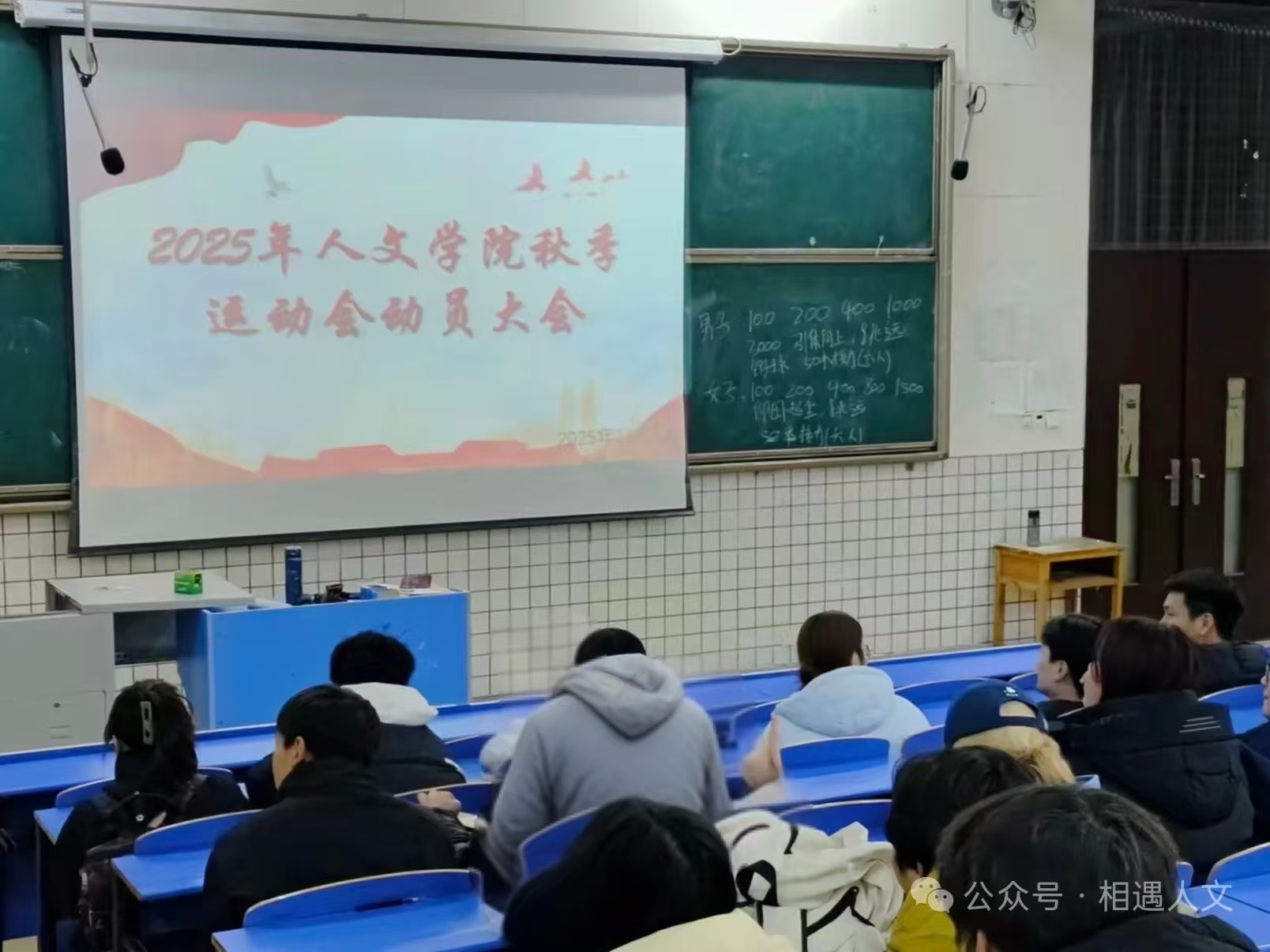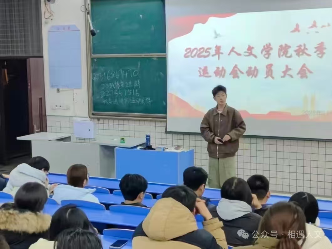为点燃同学们的运动热情、保障秋季运动会高效有序推进,人文学院于2025年11月19日晚在阶梯九教室召开2025年秋季运动会动员大会。