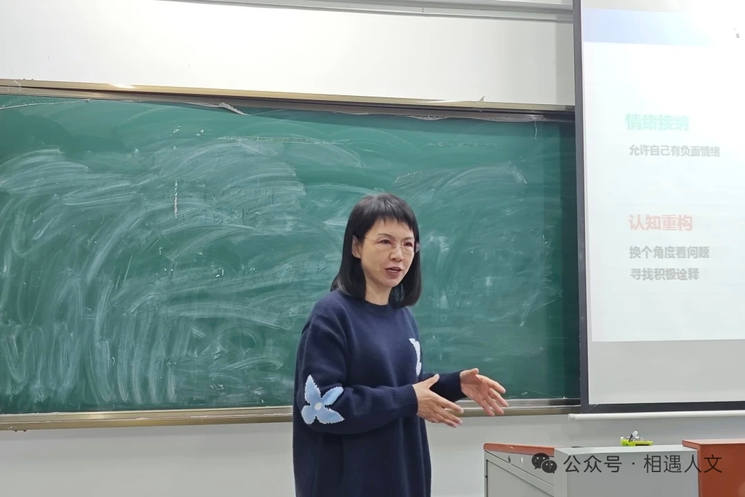 讲座伊始,李曼老师通过“心灵坐标轴”破冰活动,让同学们根据入学三个月的真实感受自主定位,在互动中快速觉察自我状态,缓解了新生的陌生感与迷茫感。针对“高考后目标真空”“选择困难”等共性问题,李曼老师深入剖析了大学生常见的学业压力、人际困扰、自我认同等心理挑战,通过埃利斯ABC理论,引导同学们认识到“并非事件本身,而是对事件的看法决定结果”。她还分享了情绪接纳、认知重构、深呼吸冥想等心理管理实用技巧,并鼓励同学们在需要时勇敢寻求专业帮助,强调“真正的强大是在风雨中为自己撑伞的能力”。