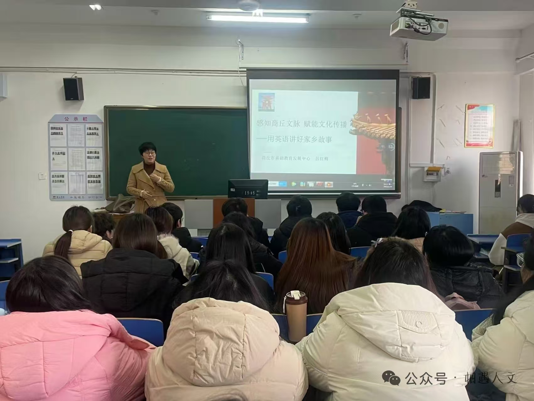 2025年12月19日,人文学院于老主楼405教室举办“感知商丘文脉 赋能文化传播——用英语讲好家乡故事”专题讲座,以商丘文化为核心,搭建起理论与实践兼具的跨文化传播桥梁。由商丘市基础教育发展中心吕红梅老师主讲。
