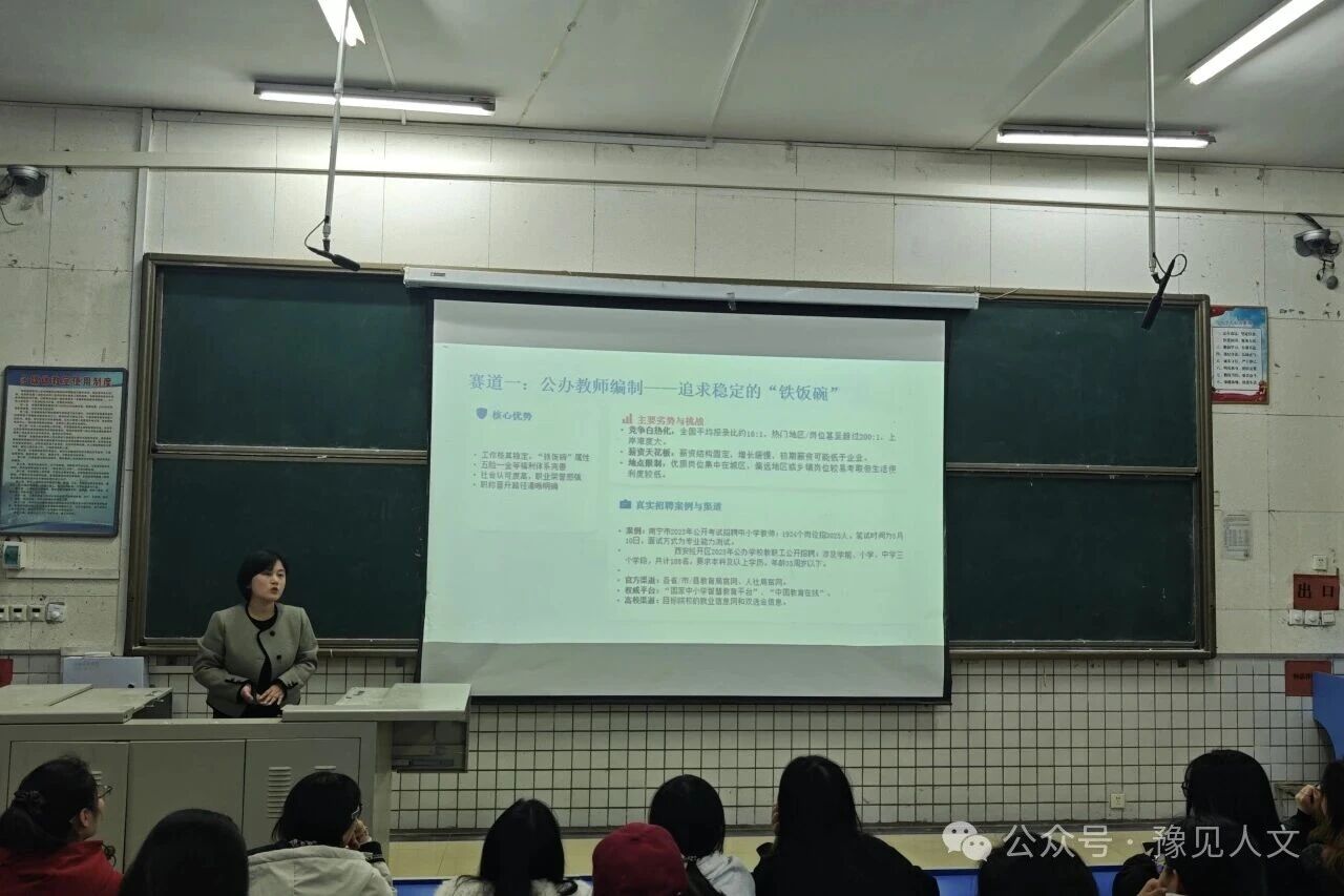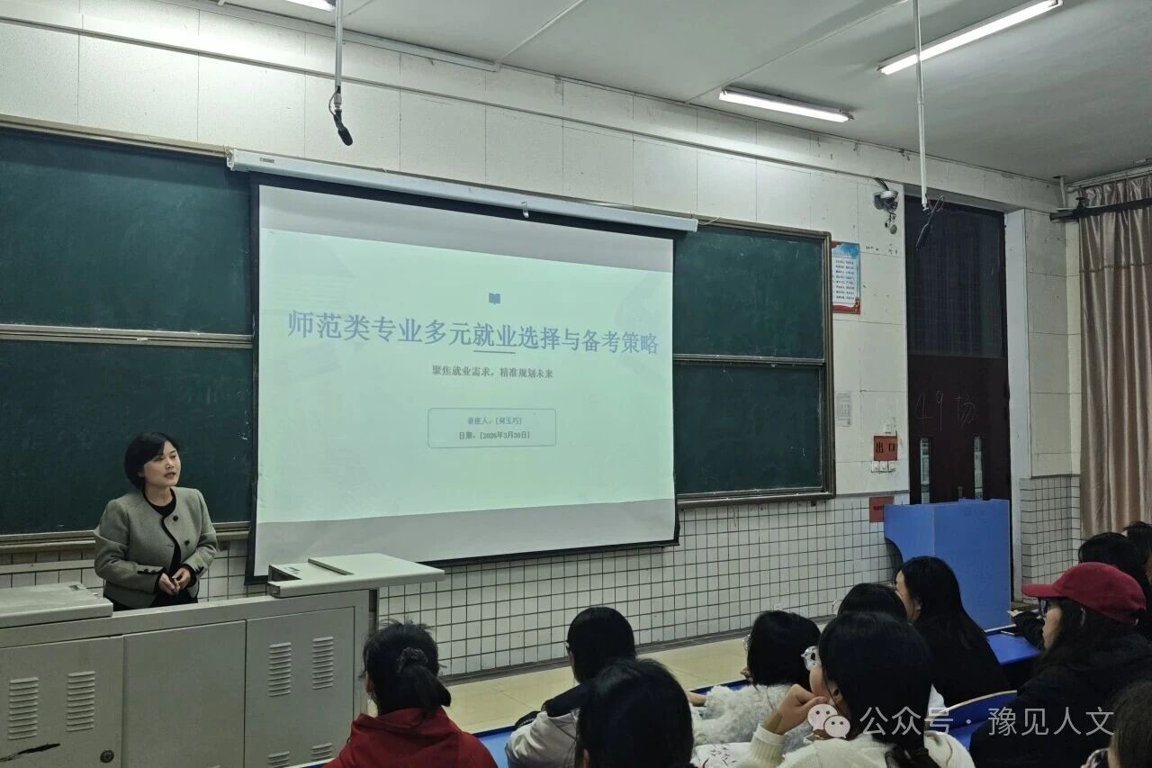 讲座开篇,她结合权威数据,简明剖析当前师范类专业就业现状,既点明就业竞争日趋激烈的现实,也指出教育数字化转型、乡村振兴政策带来的新机遇,鼓励学子打破传统就业局限,主动把握时代红利。