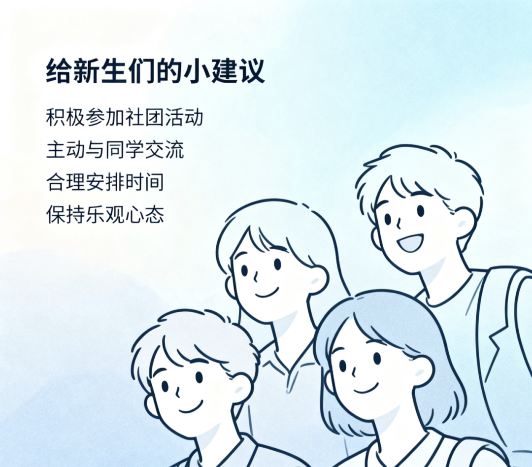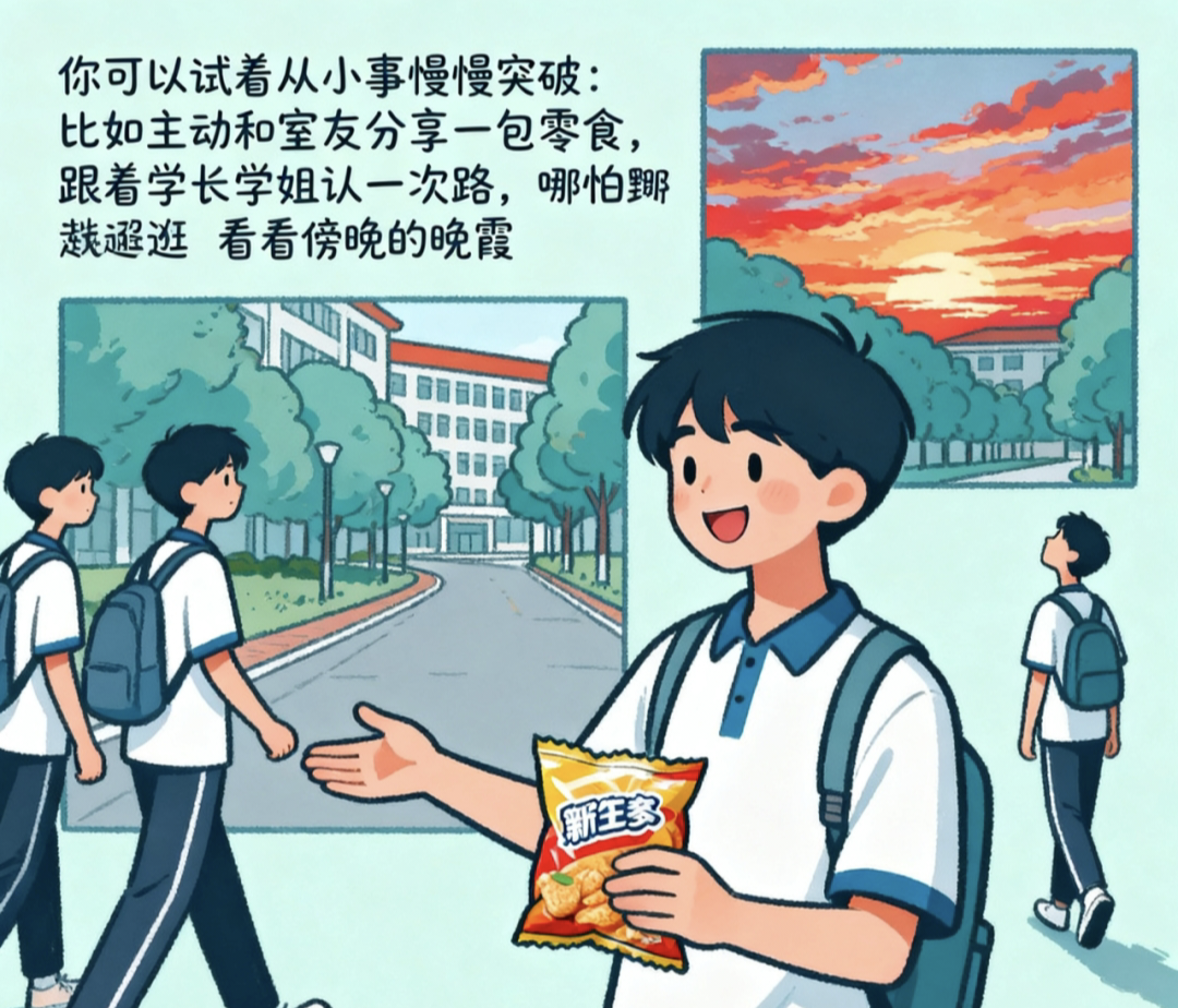 可能是整理完宿舍,看着室友和家人热络告别,突然涌上一阵想家的鼻酸;可能是拿着课表对着教学楼地图转圈,连食堂窗口都要犹豫半天不敢上前;也可能是听着身边同学聊起竞赛、社团,自己却不知道该从哪一步开始,悄悄有点慌。