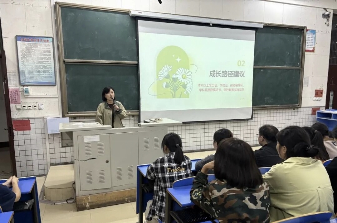 何玉巧副院长结合自身经验,从四个维度展开分享:在就业选择及数据解读环节,她通过最新报告与院校数据,呈现师范毕业生在中小学教育、学前教育等领域的就业分布,分析岗位需求与竞争态势;针对成长路径,提出 “理论 + 实践 + 技能” 三位一体培养建议,强调夯实专业基础、参与实训实习、攻克教资与普通话考试、提升实用技能;同时介绍教育机构管理、图书编辑等多元化就业方向,拓宽新生视野;还分享了扎根乡村教育、考入重点中学等优秀学子案例,激发学习动力。