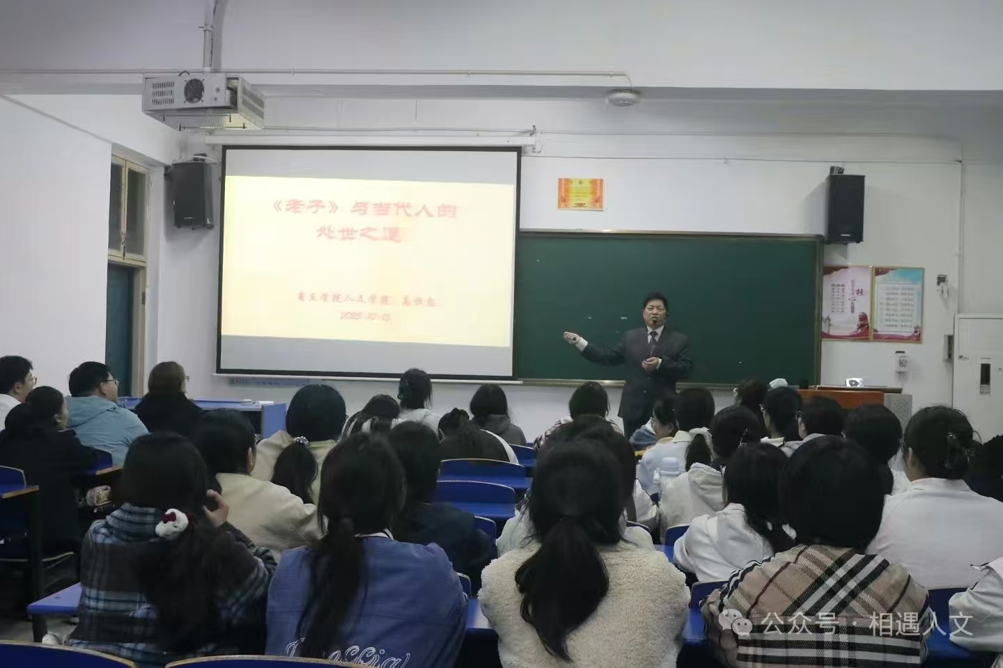 为了让传统哲学真正服务于青年成长,引导学生跳出浮躁、平衡心态,2025年10月15日,人文学院于老主楼502教室开展了“《老子》与当代人的处事之道”专题讲座,此次讲座由高恒忠教授主讲,汉语言专业的同学们踊跃参加。