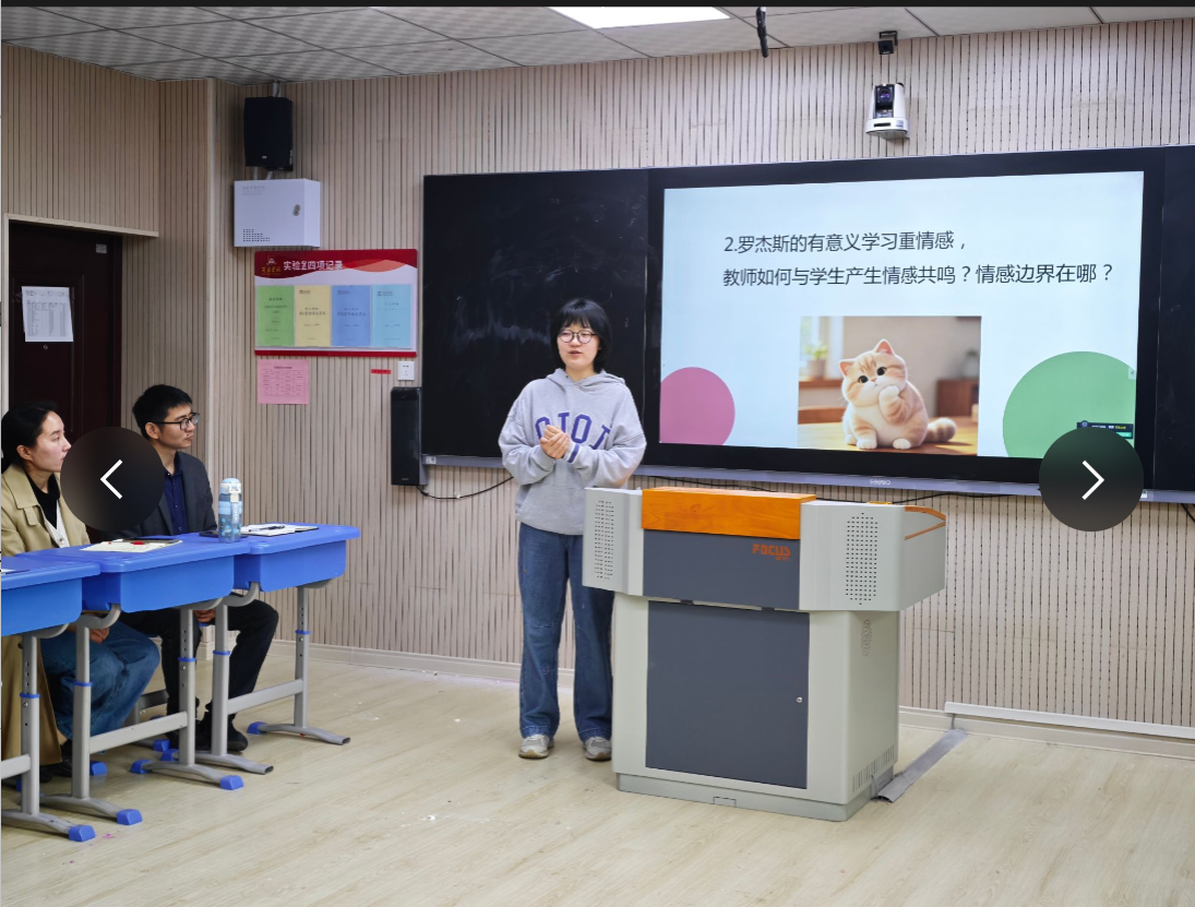 第二个议题聚焦于罗杰斯“有意义学习”理论中的情感维度。罗杰斯强调,真正有意义的学习必然涉及情感体验,教师在教学中应与学生建立真诚的情感联结。冯敏慧老师在讨论中深入分析了情感共鸣的四个条件:开放性、保持兴趣、自我效能感、预设。她指出,教师要善于创设安全、信任的心理氛围,让学生在情感上感到被接纳、被理解,从而促进真正的学习发生。与会教师还就情感边界的把握进行了深入探讨,认为师生情感交汇应建立在尊重、专业的前提下,既要走近学生内心,又要保持适当的教师角色定位。