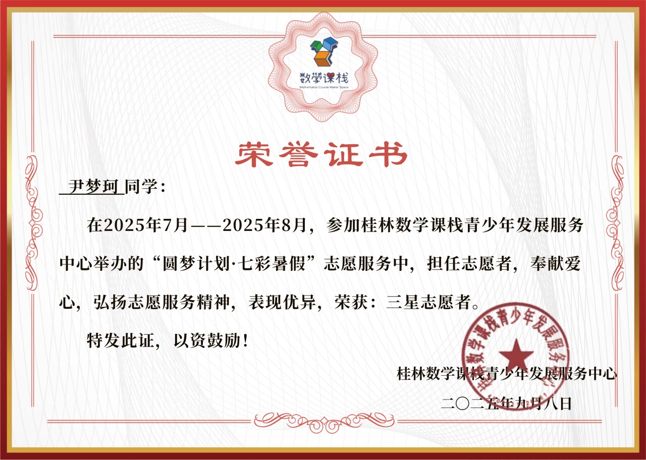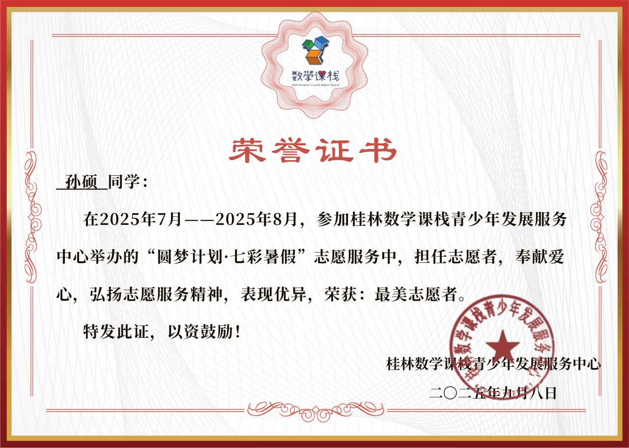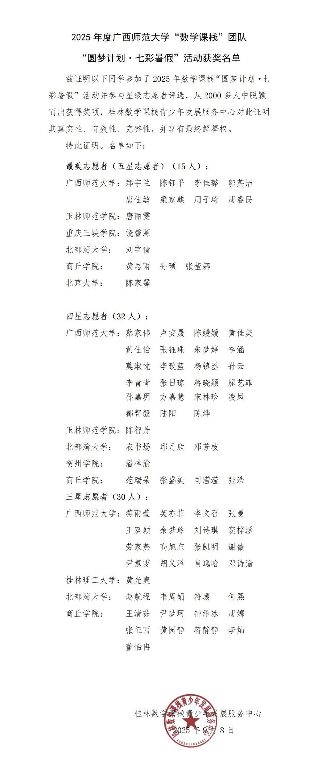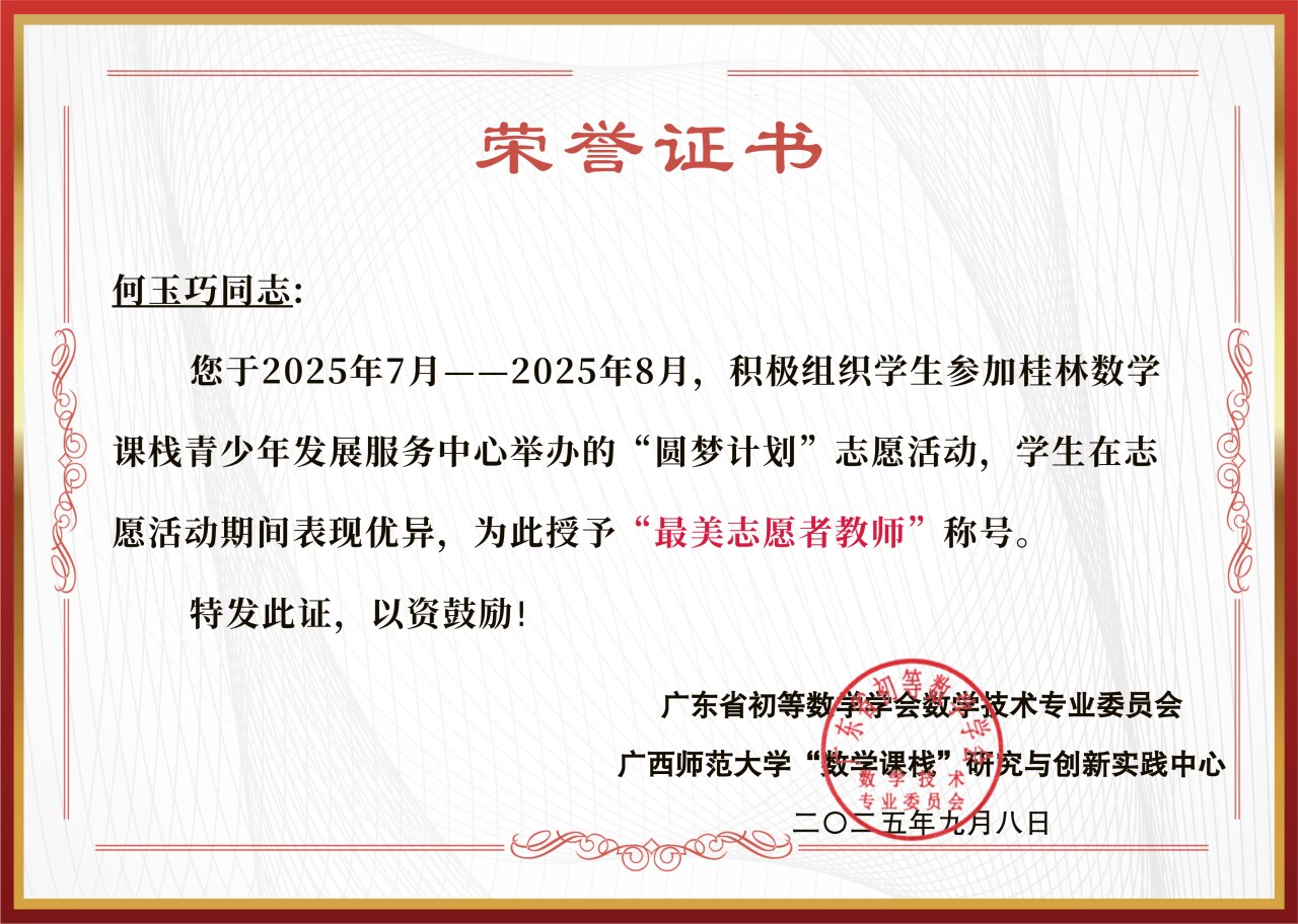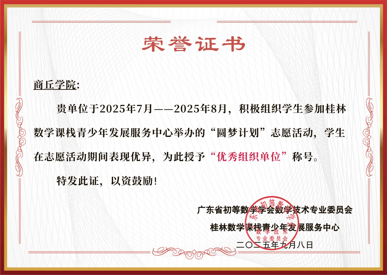 2025年7月至2025年8月,人文学院学生参加了广西师范大学“数学课栈”团队举办的全国数学教育公益活动,共有62名学生通过选拔受聘,经过层层角逐,16名学生荣获“优秀志愿者”称号。其中,孙硕、黄思雨与张莹娜荣获“最美志愿者”称号,何玉巧、胡杏培、李慧敏等8名教师荣获“优秀指导教师”称号,商丘学院荣获“优秀组织单位”。