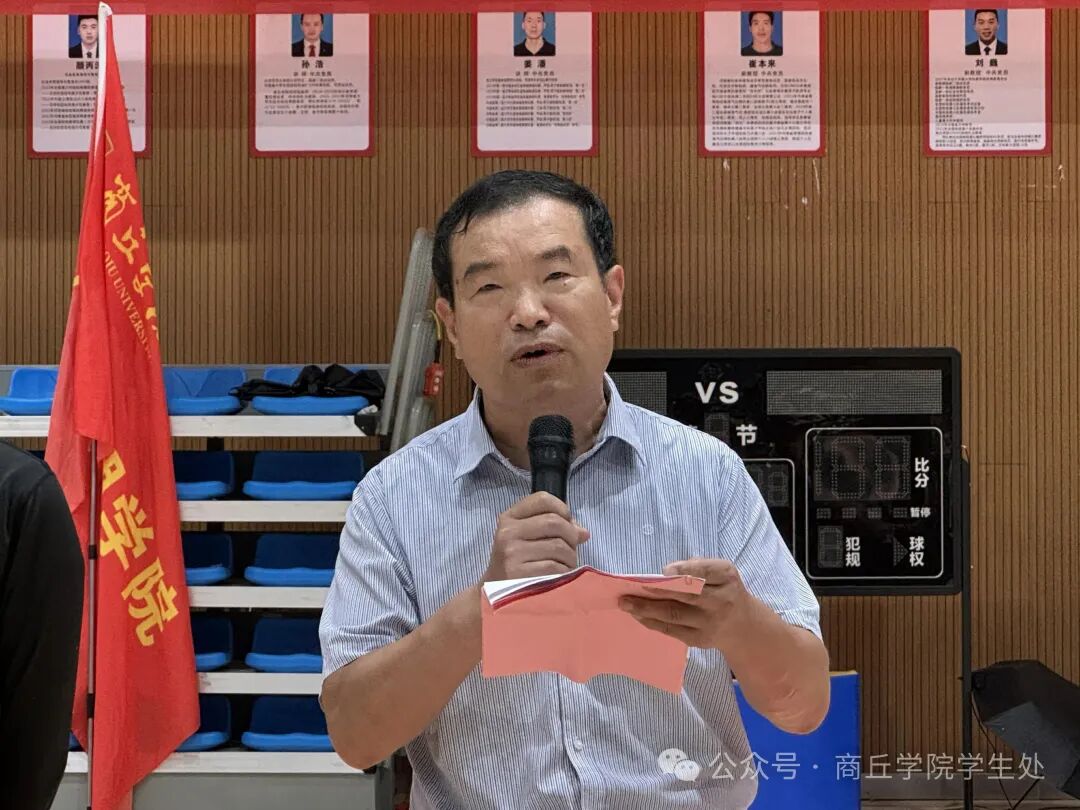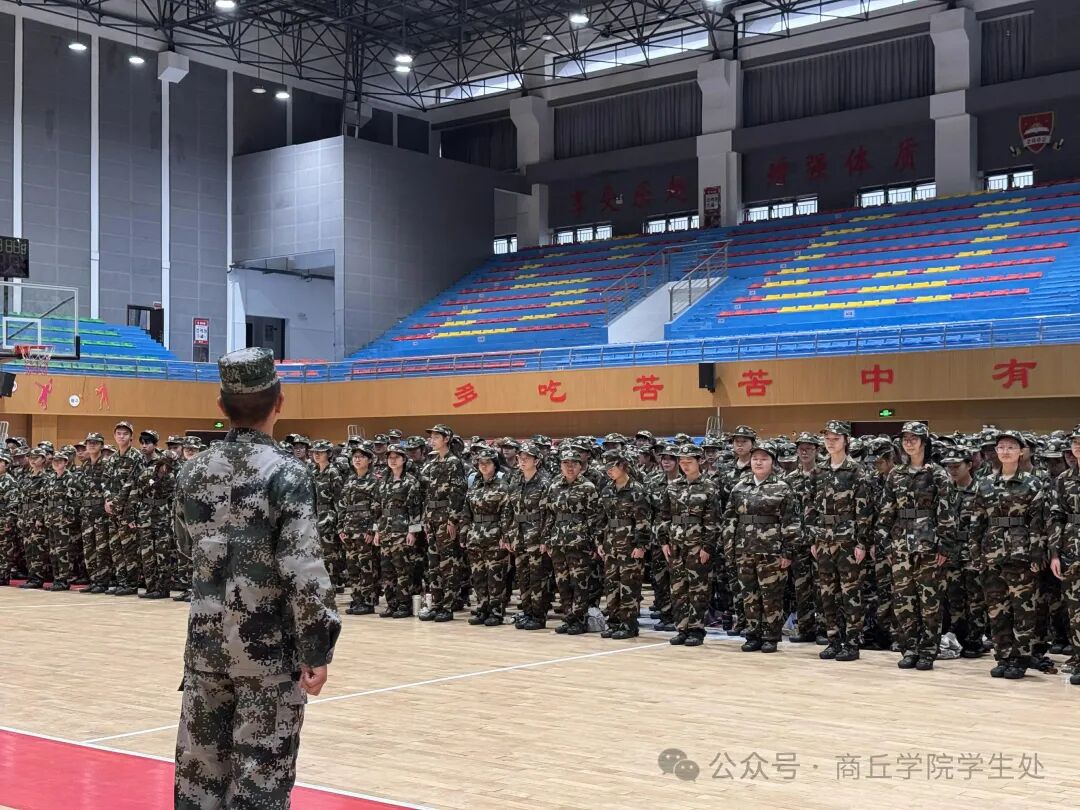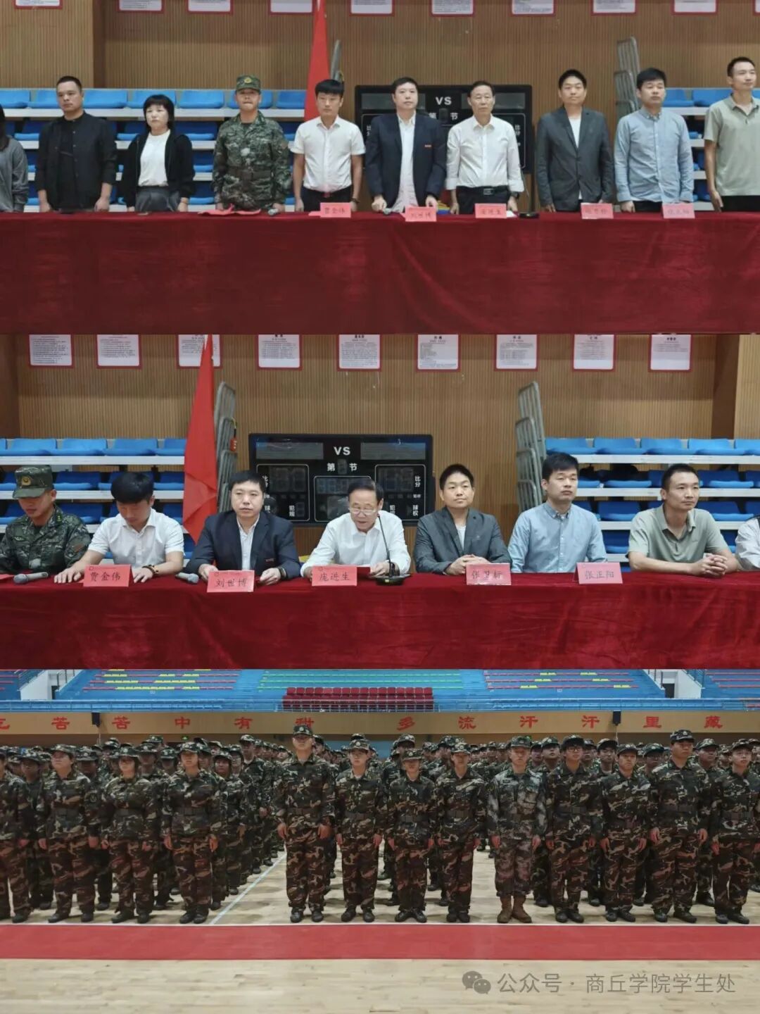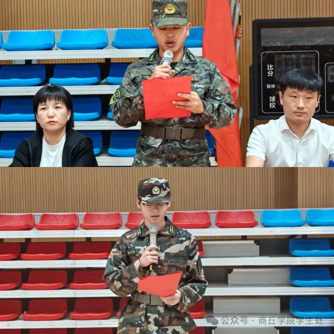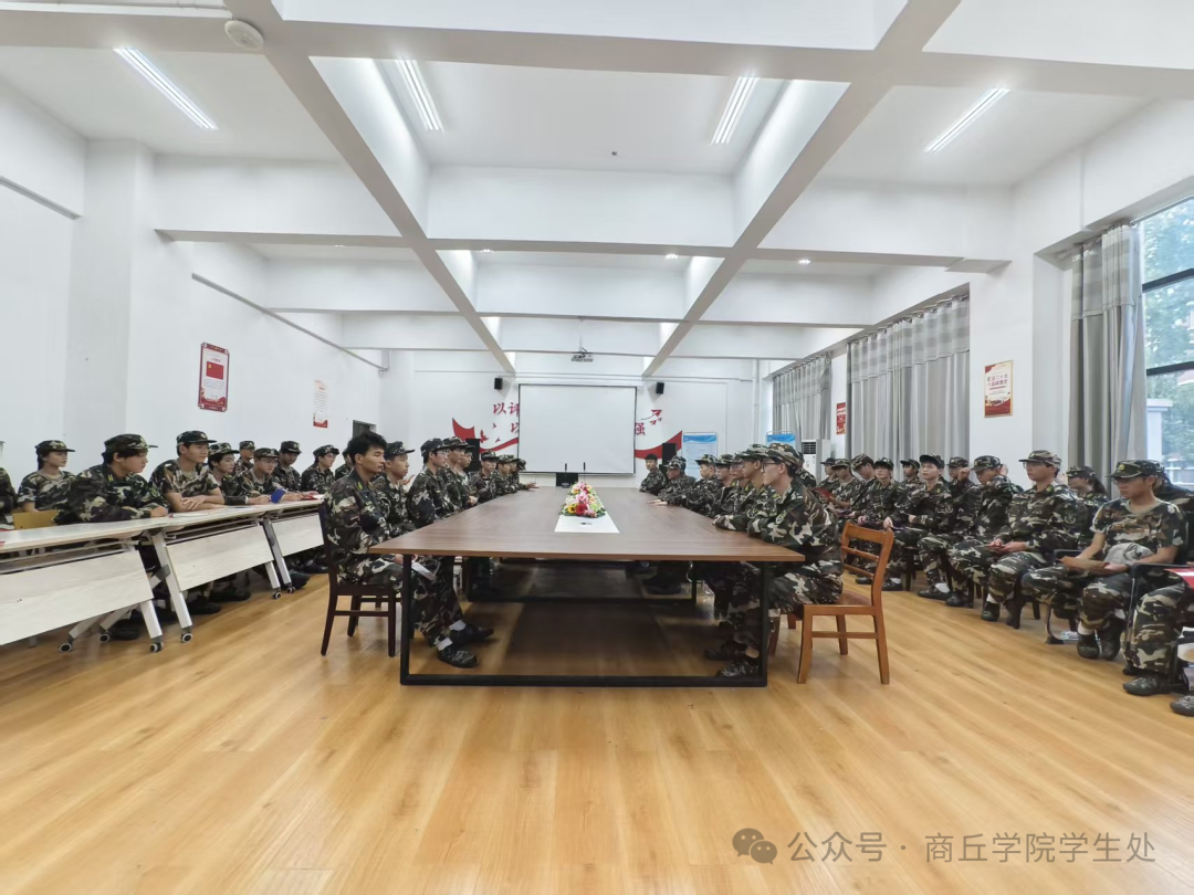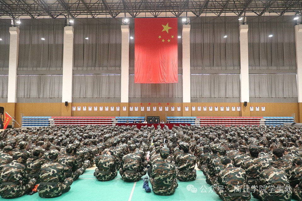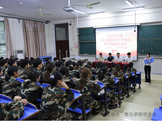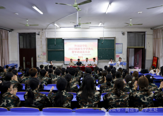 外国语学院 9月12日,为强化学生纪律性、调动积极性,商丘学院外国语学院在阶梯教室5举行2025级新生开学典礼暨军训动员大会。