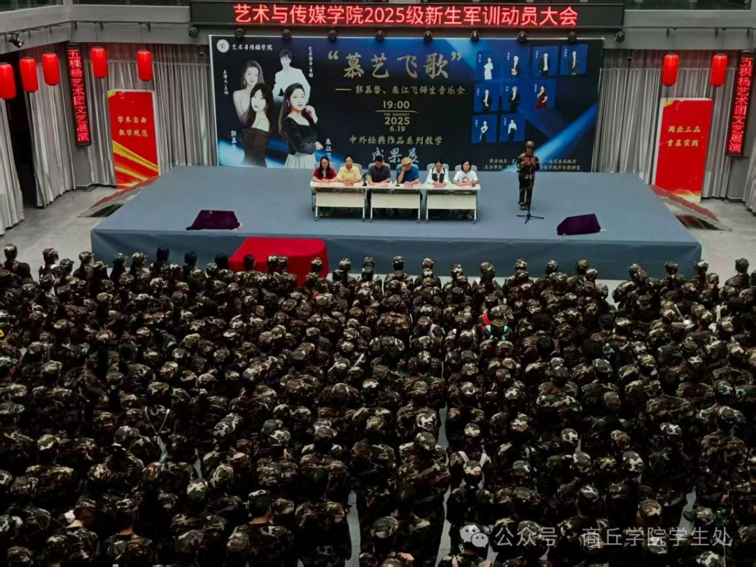 军训教官代表与新生代表先后发言。此次大会为新生开启大学生活新篇章,也为军训注入动力与信心。 艺术与传媒学院 9月12日,艺术与传媒学院2025级新生军训动员大会在艺术楼隆重召开。学院党总支书记、院长张新根,副院长崔颖,党总支副书记张书海,团总支书记侯帅琳,辅导员刘叶、王向丽及2025级新生参加,会议由张书海主持。