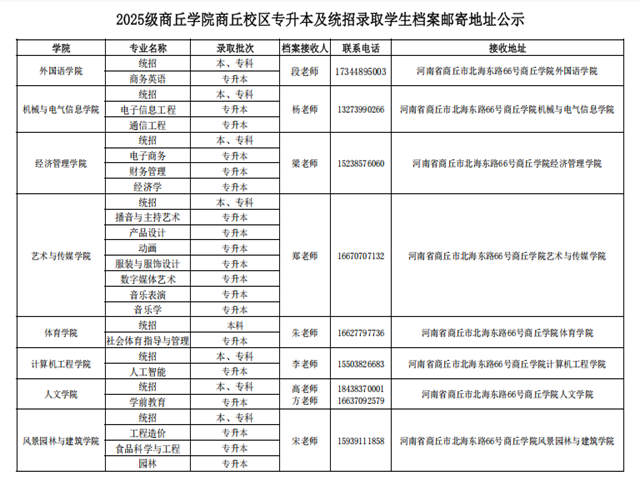 各个学院的专业名称、录取批次、档案接收人、联系电话、接收地址详见下图表: