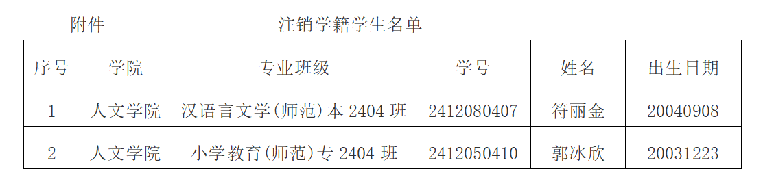 经学校校长办公会研究,同意对符丽金、郭冰欣两名学生作退学处理。现对符丽金、郭冰欣两名学生注销学籍事宜予以公示,公示时间:2025年10月15日-10月21日。