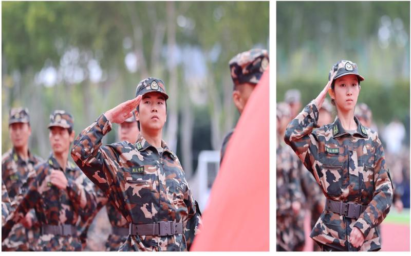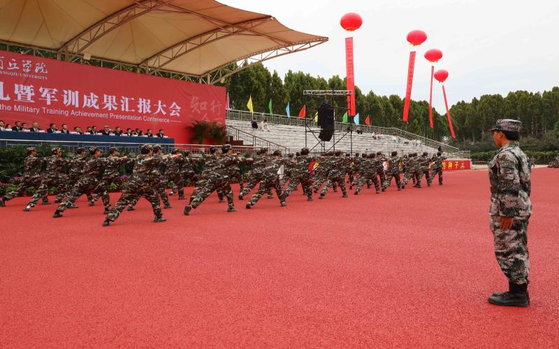 党委书记王勇军宣布军训方队分列式正式开始。由各二级学院2025级新生组成的方队口号整齐嘹亮、步伐刚劲有力,依次经过主席台接受检阅。